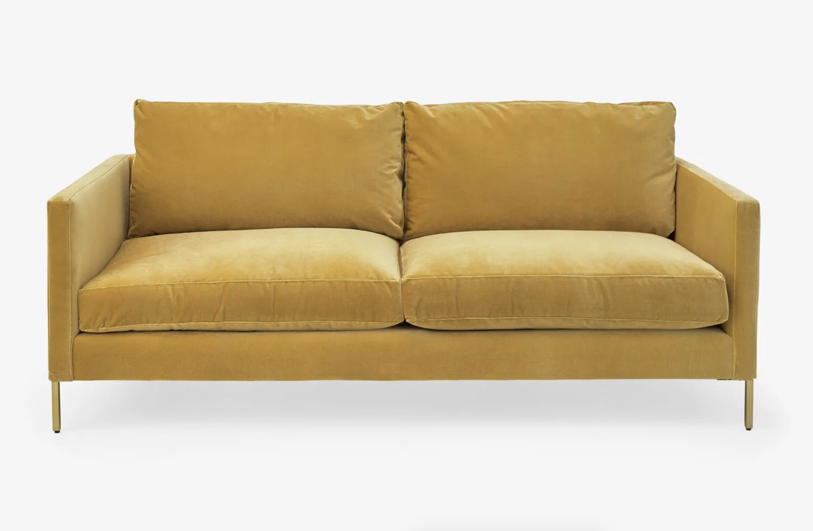 This velvet loveseat, featuring a slim silhouette and brass legs, hardly needs any additional decorative accents. Plus, a pop of color is always welcome, especially in a small space.