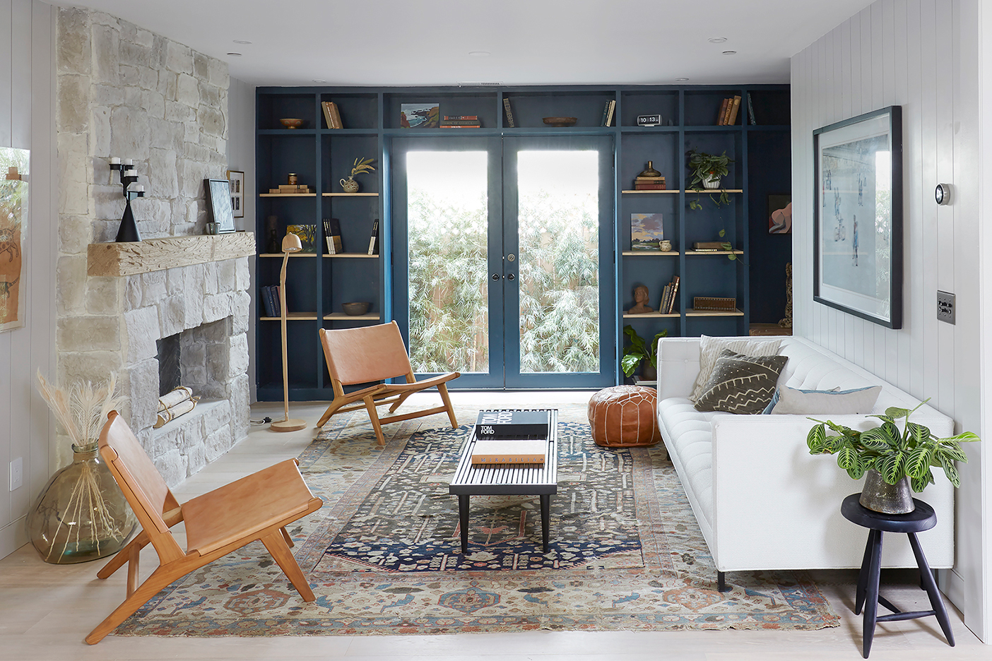 No right angles? No problem. This method lets you use rectangular rugs in oddly shaped rooms. Follow the same layering method mentioned above (put a rug on top of a larger one), but shift the top one so that it’s perpendicular to another wall in the room. If you’ve committed to a “two legs off” approach around the outer rug, apply the same thinking with any furniture that touches the smaller one (note how designer Dan Mazzarini placed his chrome and leather seats just at the edge of his flat-weave).