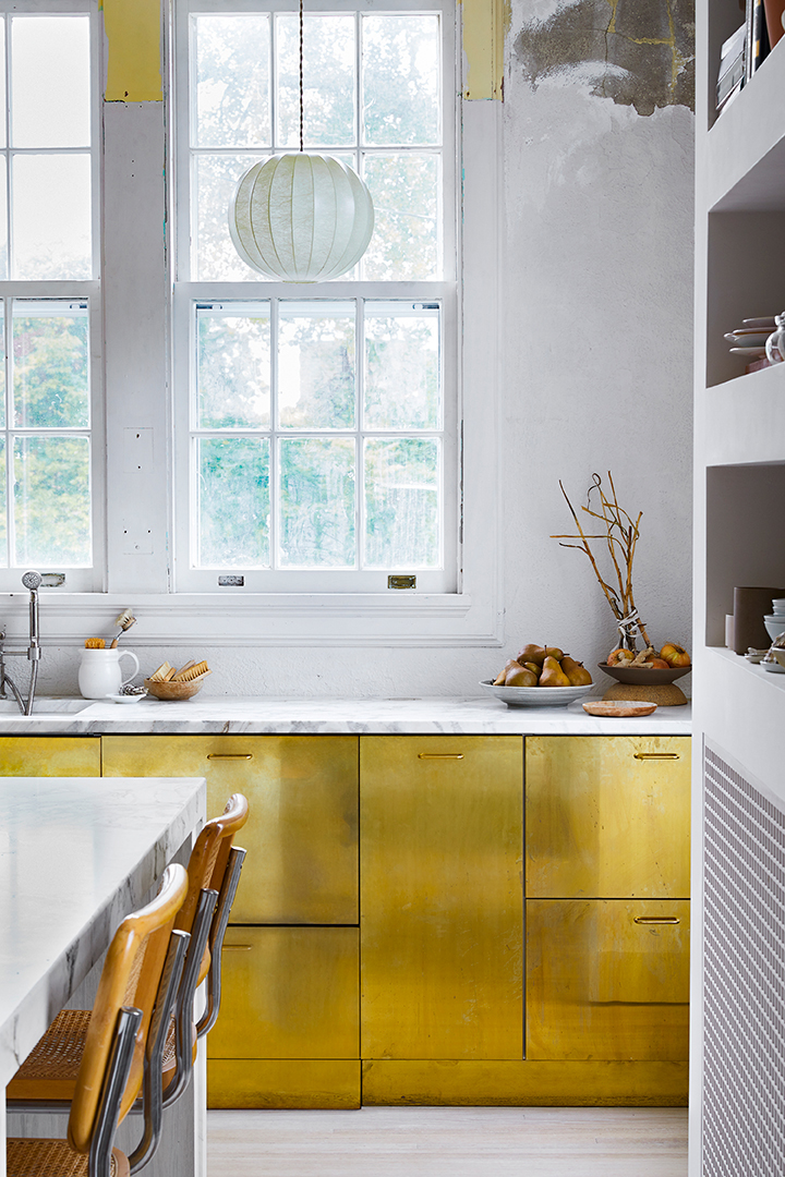 Once the practical decisions were made—double dishwashing drawers to handle the load from their massive dinner events, a prep space with a large 1920s garden sink, and a trough that functions as a spot to cut and arrange flowers or drinks—they were able to focus on more dramatic touches, like the brass-front cabinets that practically glow in the sun. “We chose a lot of ‘living finishes,’ things that will age as they are used,” she says. “The brass will only get better with time.”