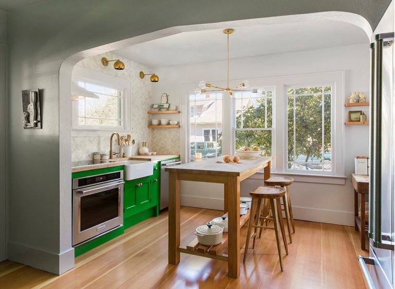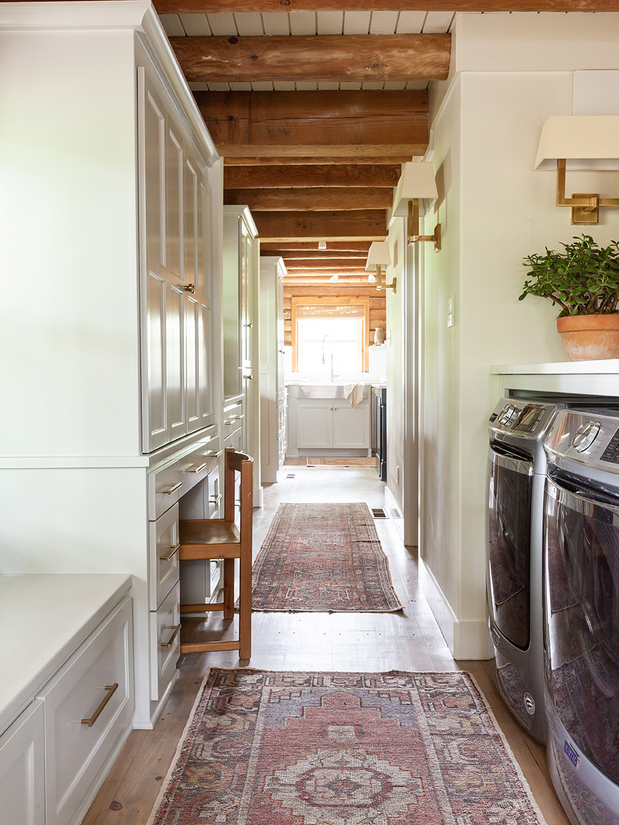 Rather than compromise the two large windows in the laundry space that’s just around the corner from the kitchen, the designers constructed a low bench with drawers so the owners can stow away cleaning products and use the top of the surface for folding and sorting. “If guests come over and use the bathroom, everything automatically feels put away,” says Brett. “They don’t feel like they’re walking through your dirty clothes.”