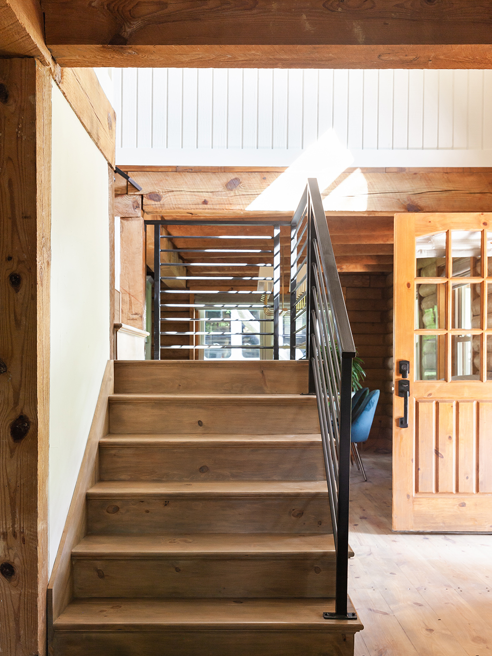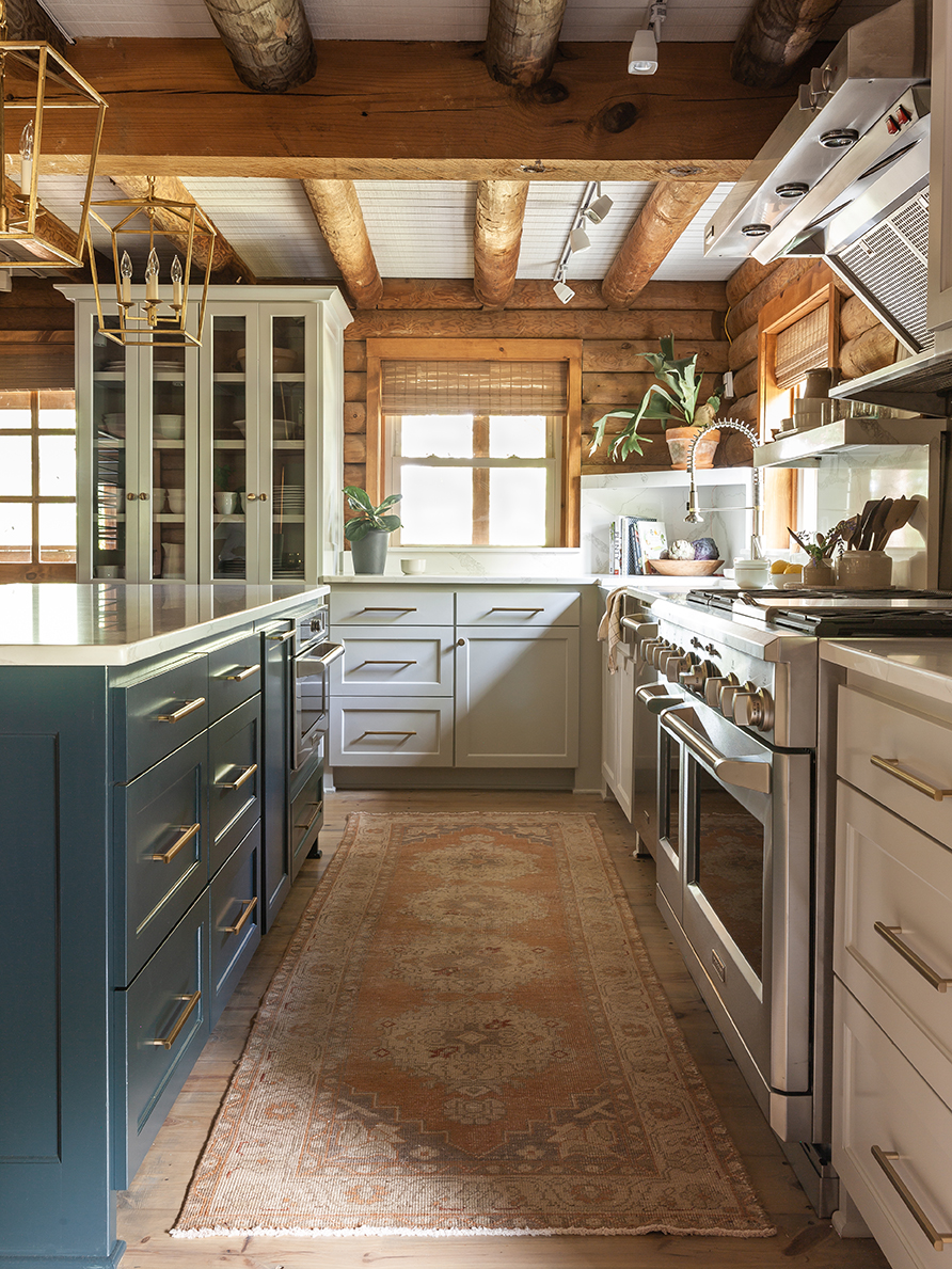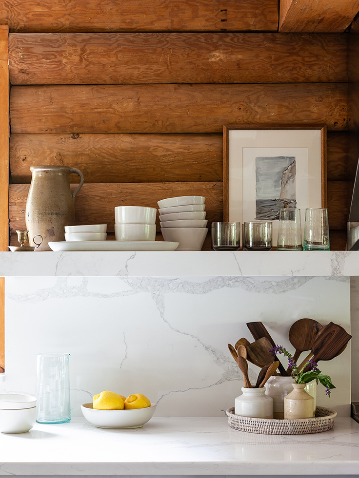 After having lived with the round brown logs for so long, the homeowners were okay with hiding some of them in the kitchen, so the designers continued the quartz backsplash up one of the corners to make a floating shelf. The platform provides extra storage, but it also switches up the geometry. “Nothing is ever really square with a log cabin,” says Brett. “This allowed them to get a sense of straightness and change the way the kitchen felt.”