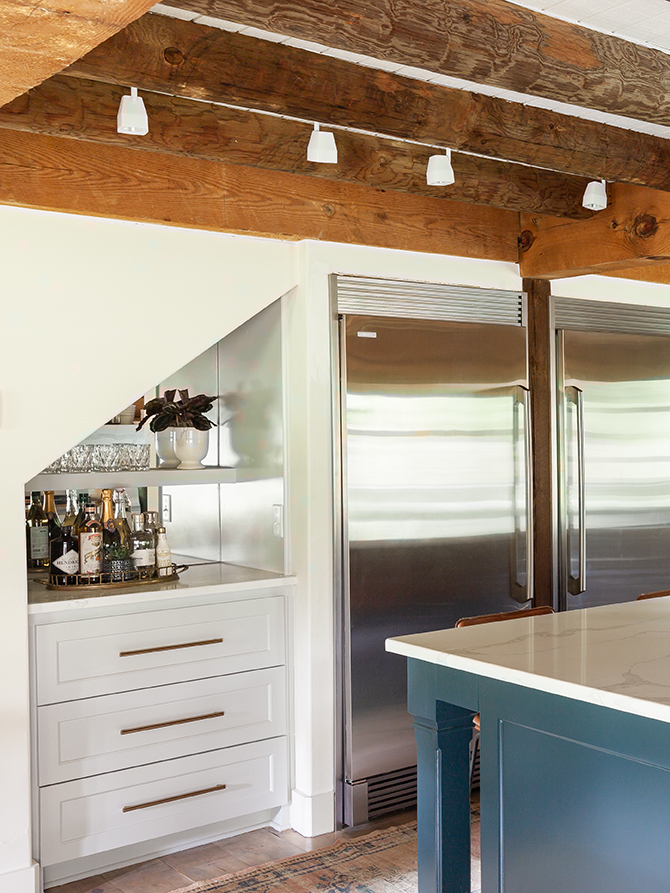 Removing the upper cabinets that used to hang between the cooking area and the dining space had a major impact on the first floor, visually. For the new upper cabinets, painted in Benjamin Moore’s Stonington Gray, the Phillipses went with glass doors for a furniture feel (the owners previously housed their dishware in a large hutch and liked the look of it). Bulky items, such as the refrigerator and freezer, are now tucked neatly underneath the stairs.