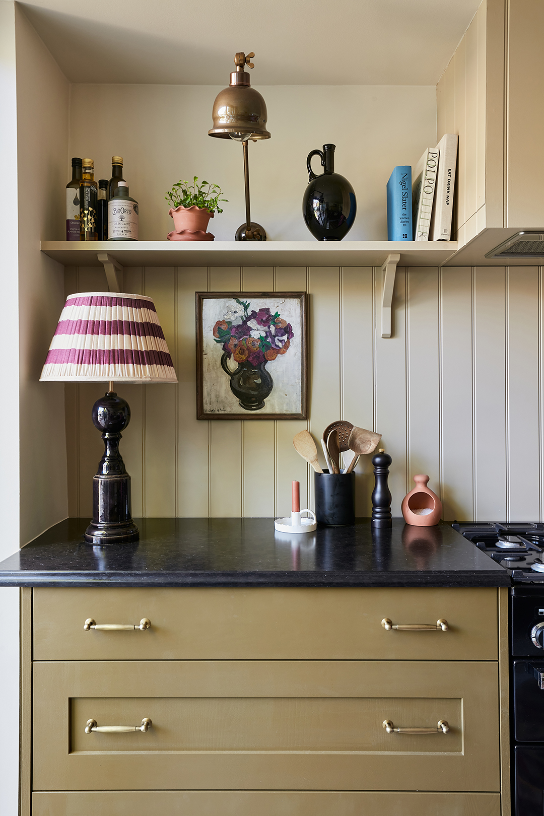 For speed, the kitchen was sourced from Howdens, a U.K.-based retailer specializing in stock cabinets that come preprimed. But you’d never know; Stephens painted them in a rich, mustardy shade of green and decked them in handpicked brass pulls and knobs. She then used lighter tonal colors to add warmth. “I wrapped it all around, including the ceiling, which was low,” she says. The walls are clad in sheets of tongue-and-groove paneling that can withstand dampness and changes in temperature, and proved just the material to conceal the extraction fan, something that Stephens would happily live without but which the clients were set on keeping. The Silestone worktop, with its grooved edge, makes the whole outfit look even more high-end than it really is.