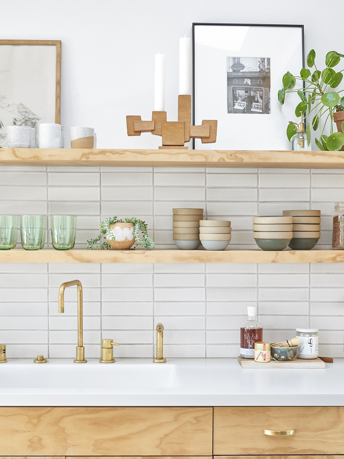 Open shelving spans the back wall of the kitchen, and it has revolutionized cleanup. “I barely have to step away from the dishwasher when I’m unloading it,” says Genie, who loves a Heath Ceramics plate and has started throwing pottery on a wheel in the backyard. “And knowing it’s organized with the exact amount of space we need keeps me from buying more.”