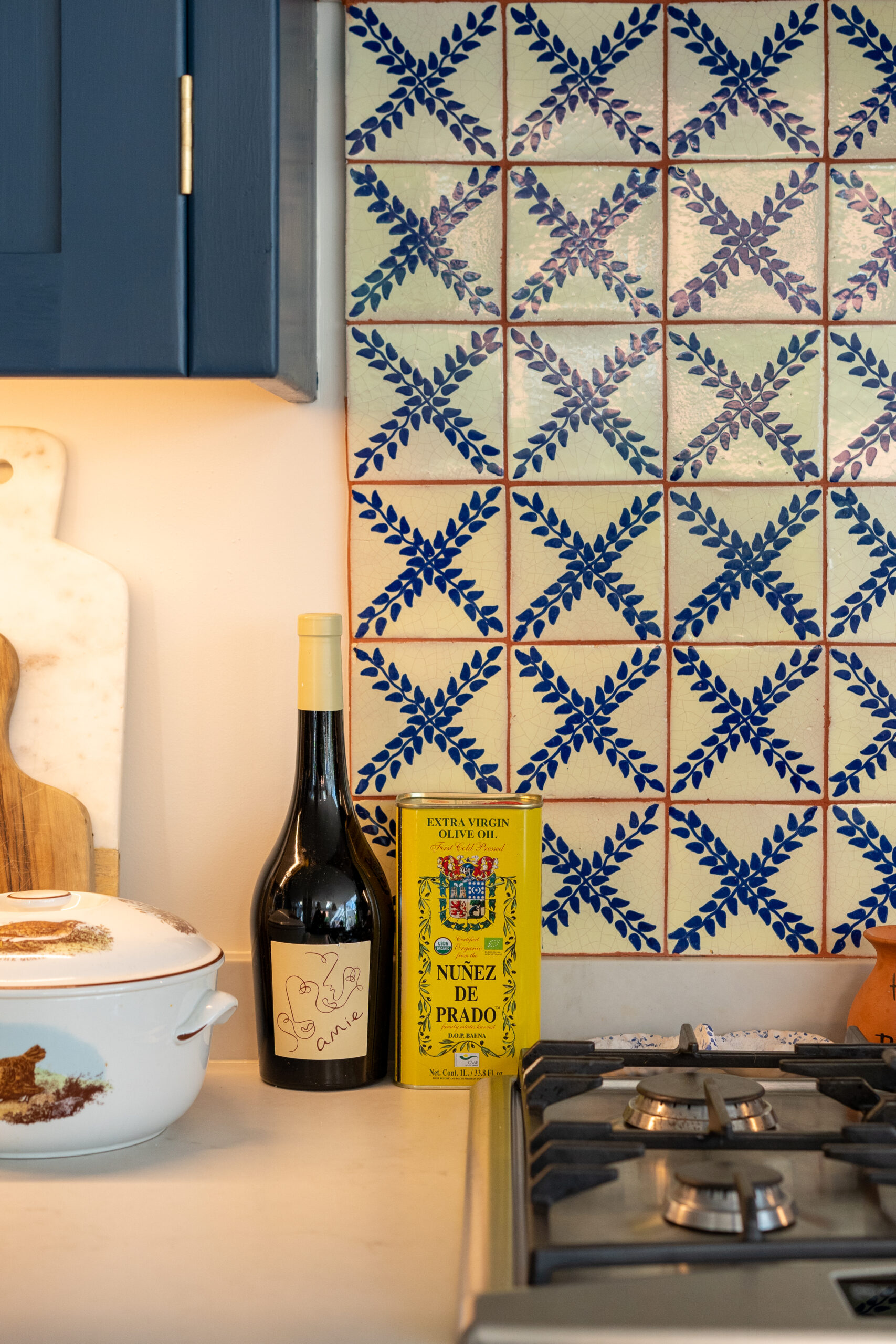 In the kitchen, the couple kept the original cupboards, painted them a deep blue, and changed the hardware and countertops. The layout was begging for an island, so Roe had one made by British Standard to match the cabinets. “It kind of looks like it has always been there,” she remarks. To make the space feel less shiny and new, she found hand-painted Mexican tile for about 80 cents each in East London for the backsplash. “I wanted the grout to be terracotta rather than white, because it completely changes the feel,” she explains. Above the island, Roe repurposed an Alice Palmer pendant lamp from her old house and had a second one made to match.