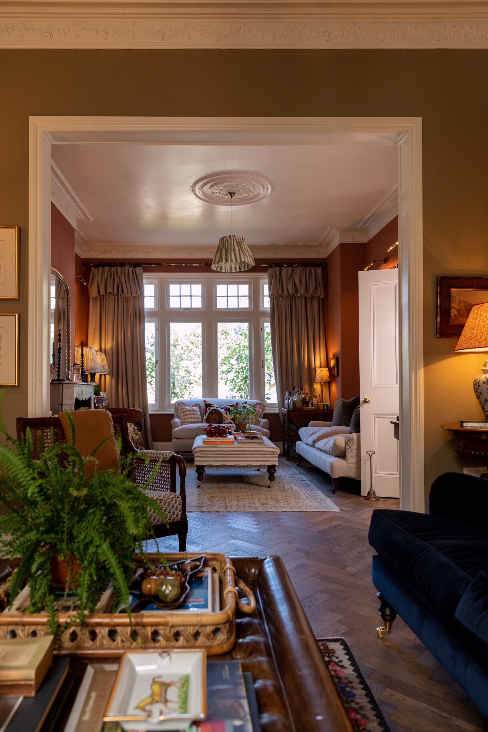 Widening an archway between this space and the adjacent snug (the British equivalent of a den) to create an open feel was the only structural change made to the house, so the palettes had to flow together. Inspired by a brown and cornflower blue outfit she saw at a photo shoot months earlier, Roe landed on a navy sofa and Edward Bulmer’s Mummy—a deep tan—on the walls. “It’s nice when you look from one room into the other and the colors work together and complement each other in a tonal way,” she explains.
