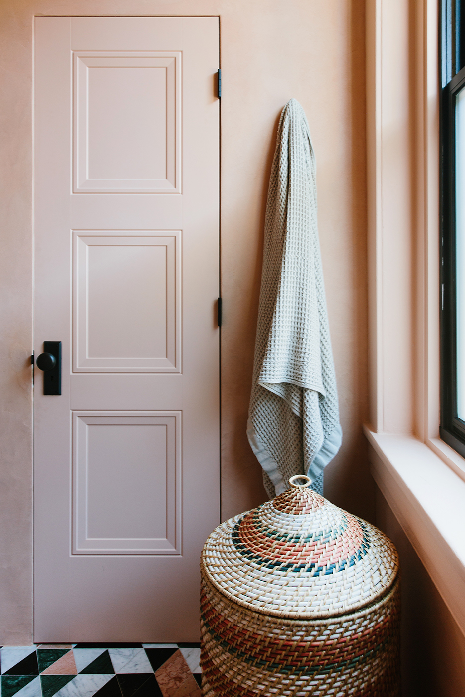 Inspiration for the space came by way of Greece, where Journey and Jacobs had recently traveled. “We were kind of obsessed with the bathrooms there, with the plaster floors, walls, and ceiling,” says Jacobs. “Everything was just this one material and it had this beautiful, echoey sound.” Lauren had mentioned wanting a blush bathroom, so the designers ran with the hue but tweaked it slightly to read more like a neutral terracotta. “We didn’t want to overwhelm the senses, and we wanted it to have a feeling of serenity, as well,” adds Jacobs.