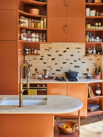 She opted for mostly white walls, with finishings and furniture in muted greens, blues, and pinks that are punctuated with whimsical touches, like a graphic animal-print rug and her own handmade woolen tapestries. The kitchen is an ode to Southern California with its pistachio cabinets offset by a marble island, copper-topped barstools, vintage-style Smeg appliances, and pastel pendant lamps.