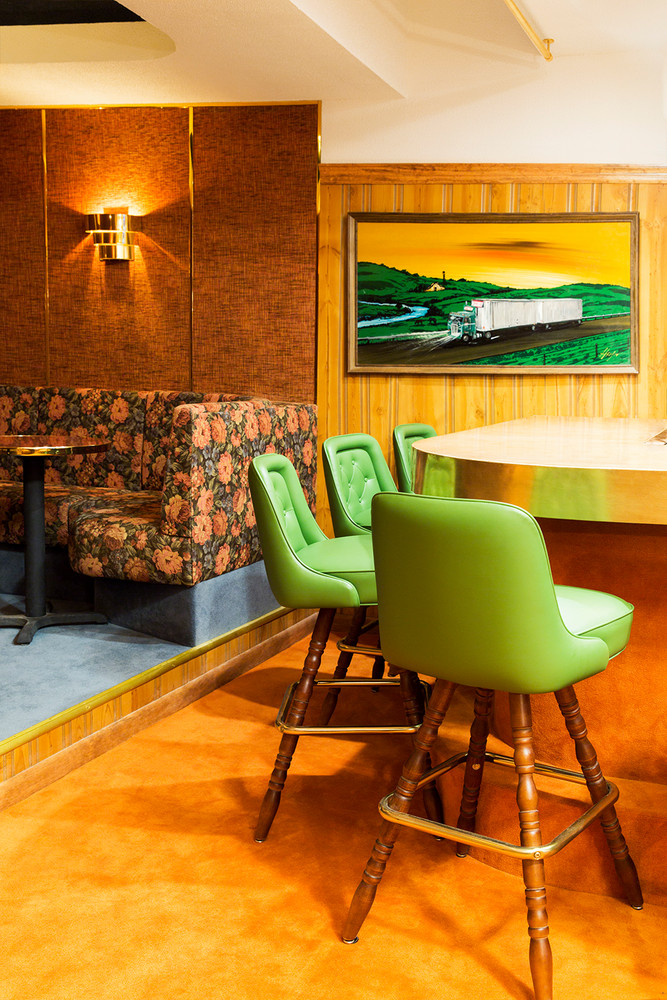 “A lot of the base materials we used were the same as what people worked with in the mid-century,” says Hales. “So the walls and floors are basically all wood paneling, cork floors, burnt orange carpet, and wallpaper.”