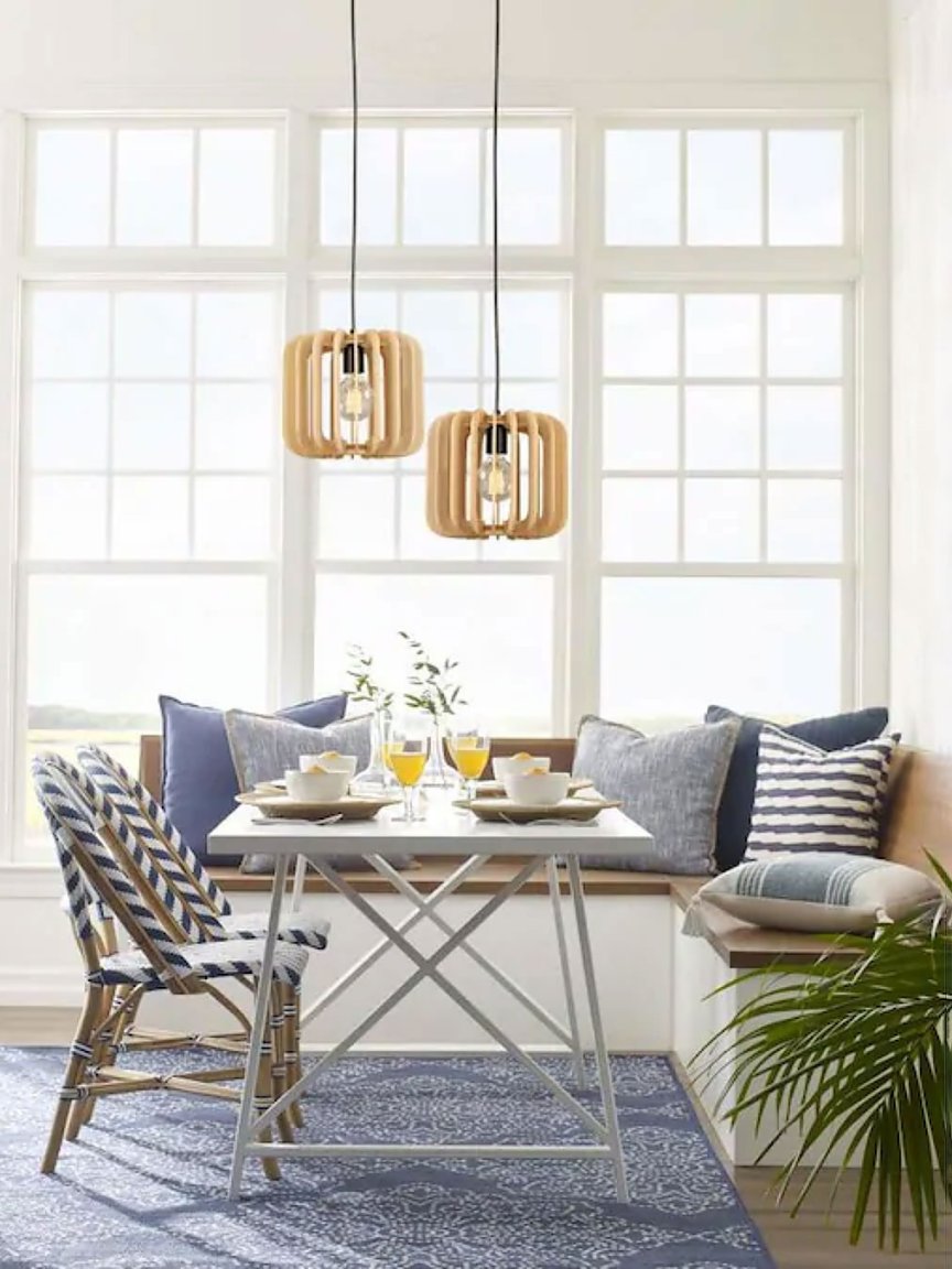 Natural materials and subtle coastal blues rule in Wu’s assortment of casual pieces, which pay homage to his self-described home away from home. Keep the season going with a couple printed pillows and a woven pendant light for your dining room table—to be accompanied by a pitcher of spicy margaritas, of course.