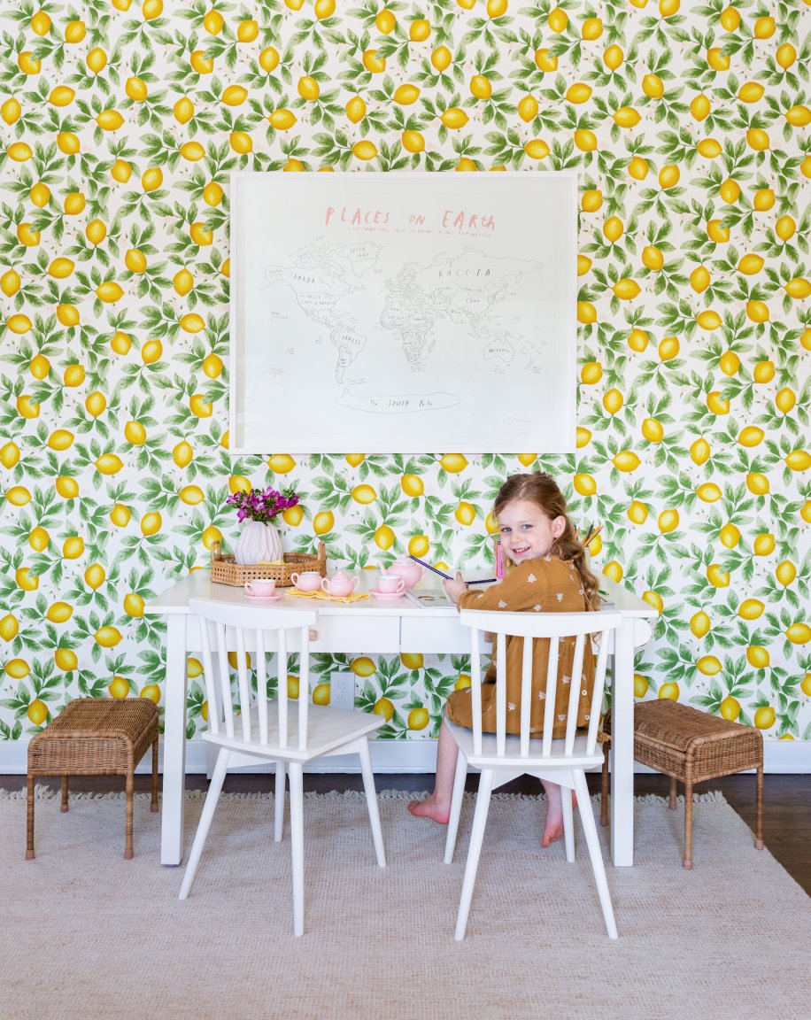 “Since Vivian could talk, she has been obsessed with yellow,” shares Brenner. “Everything needed to be yellow: clothes, toys—even a yellow-themed birthday party. Naturally, she loves lemons—because they’re yellow—so we specifically designed the wallpaper with her room in mind, and that was the starting point.”