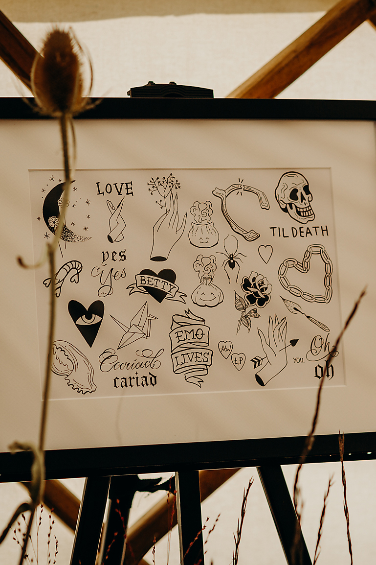 Lydia and Roo’s bucking of tradition went beyond just aesthetics. They chose to forgo the typical first dance, cake cutting, and groom’s speech in favor of a more bespoke celebration. The most inventive part of their wedding? A tattoo station with flash sheets designed by the couple.