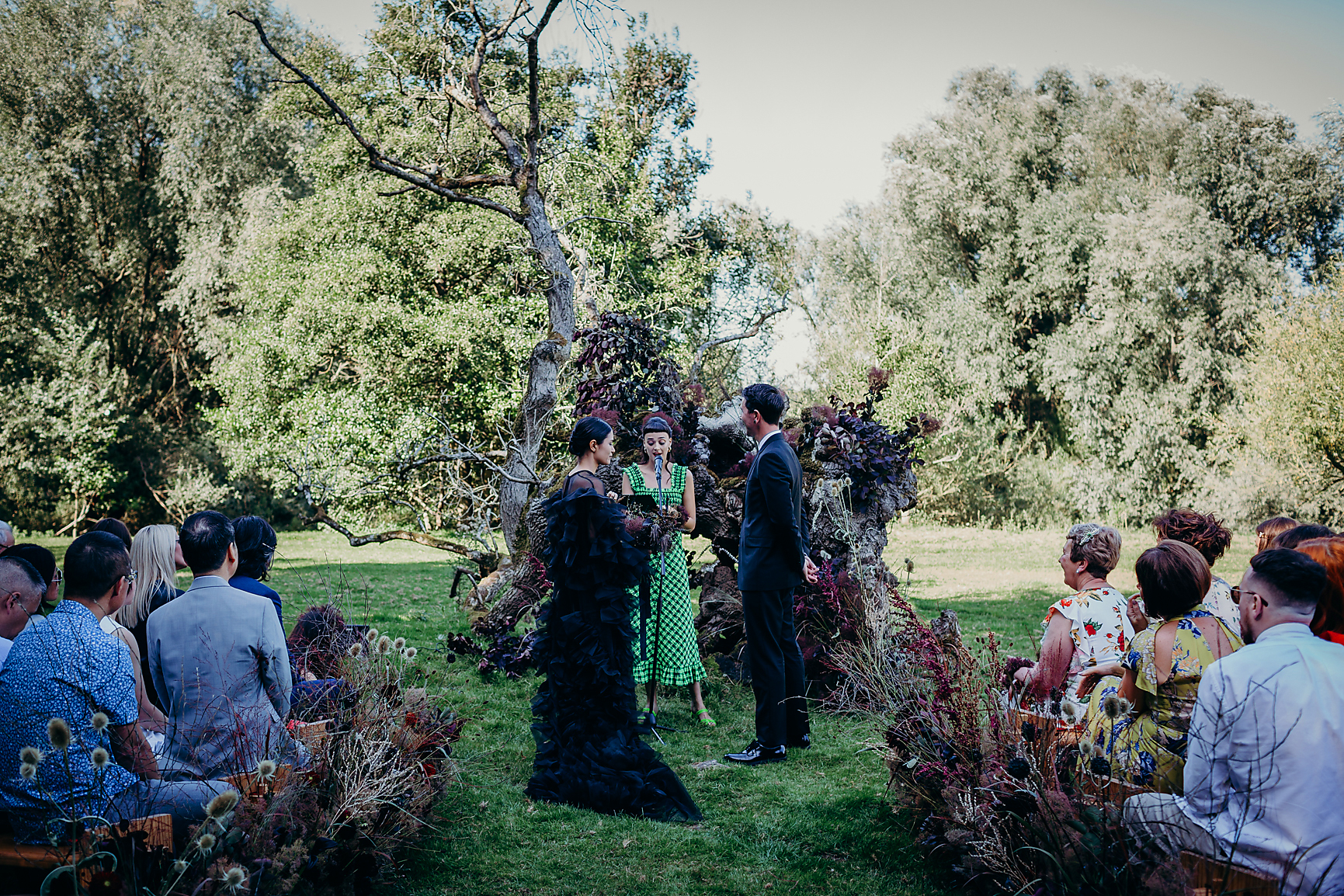 From Wales, they moved together to London, stayed there for nearly a decade, lived in New York for three years, and now have settled in Portland, Oregon. Lydia and Roo never thought they’d get married, but once they hit 30, they decided to celebrate their strong bond. When the pair tied the knot this past August, they chose to nod to their emo roots: What better way to do so than with a black wedding dress, a jazz band playing emo covers, and a fallen tree for an altar? Here, Lydia shares how they planned a day perfectly tailored for their unique love story.