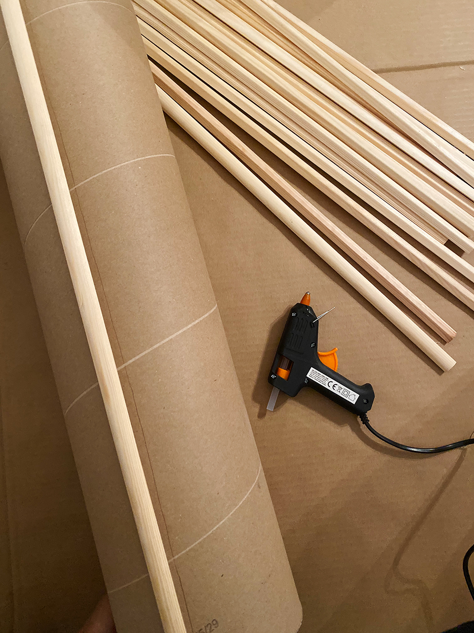 Using a hot-glue gun, trace a line on the backside of each dowel and stick them individually to the tube—be sure to use a strong enough adhesive, as hobby glue won’t be able to hold the pegs. Let it dry overnight.