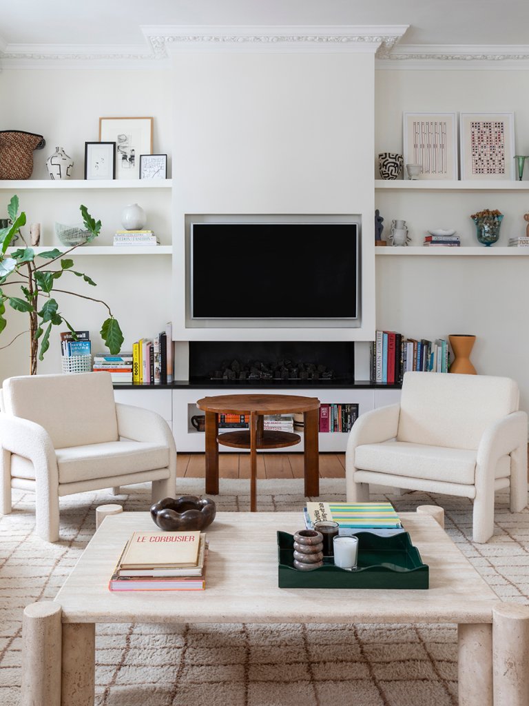 Which was crucial, considering it can be seen from nearly every vantage point in Furlong’s main room (fellow small-space dwellers can sympathize). That’s why she plopped her pedestal table perpendicular to the fireplace to smoothly transition from the kitchen to the living area; it functions as an island by offering more room for food prep than her actual counters. She even traded in her former dining chairs for a new set of stools from Hem that soak up far less square footage. “I can just tuck them under the table,” she points out.