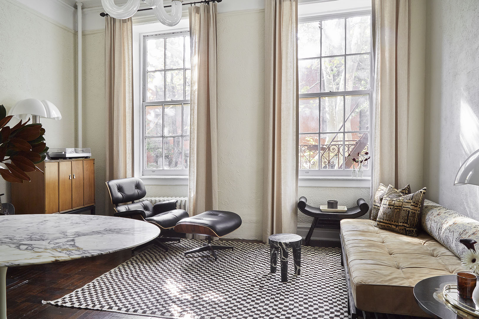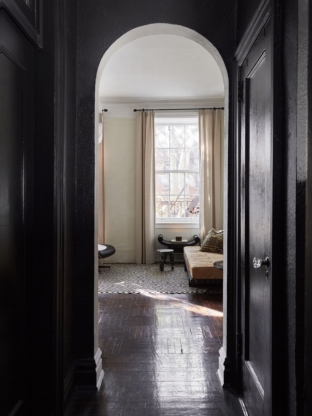Everywhere you look there’s a hint of marble or a moment of contrast, like the living room swathed in Farrow & Ball’s Satin Slipper and the fireplace in moodier Jitney. (Hot tip: An 18-inch paint roller will save you time.) In the bathroom, Furlong struggled to figure out her approach at first. After taking layers of Citristrip to a painted-over window, though, she decided to embrace the lack of a view, coating the trim in black and layering a copper cloverleaf-pattern grate over the bare glass.