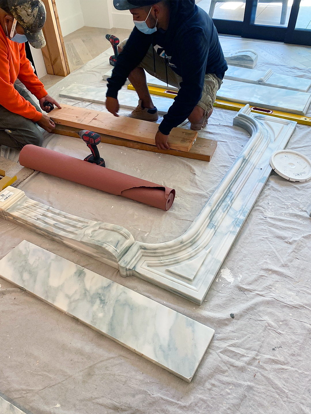 The problem was when the mantel arrived in its crate, it was split up into 60 pieces and weighed more than 750 pounds. “I just assumed it would come assembled,” says Monkhouse. “That was a learning experience.” Fortunately she always tells her clients to budget an extra 10 to 20 percent, so she was able to hire a stonemason to come to the house and put it together (he did it in one day).
