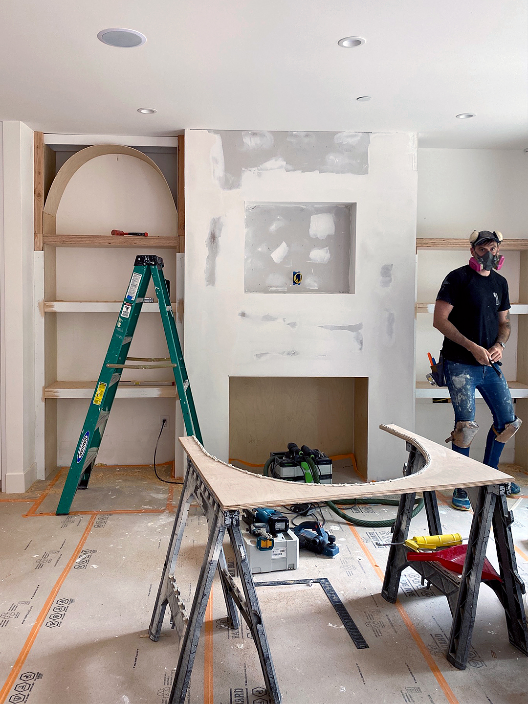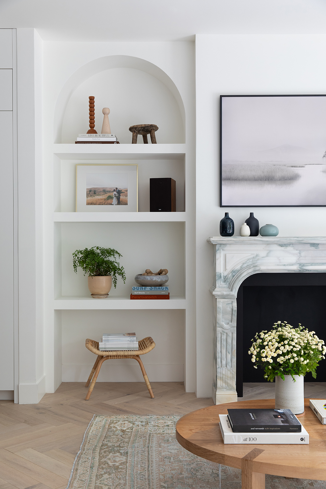 One of the things that was evident from the owners’ inspiration images was that the mantel had to be real marble, not just phony plaster or wood. Monkhouse tracked down a place in Florida called Fine’s Gallery that sells prefabricated fireplace surrounds. “They range from super-ornate to borderline crazy to minimal and modern,” she says. Once she put the order in for their Arabascato marble one, she tasked local design consultant and handyman Jasper Montgomery with executing the bump-out for the feature and the arched built-ins that would go around it.