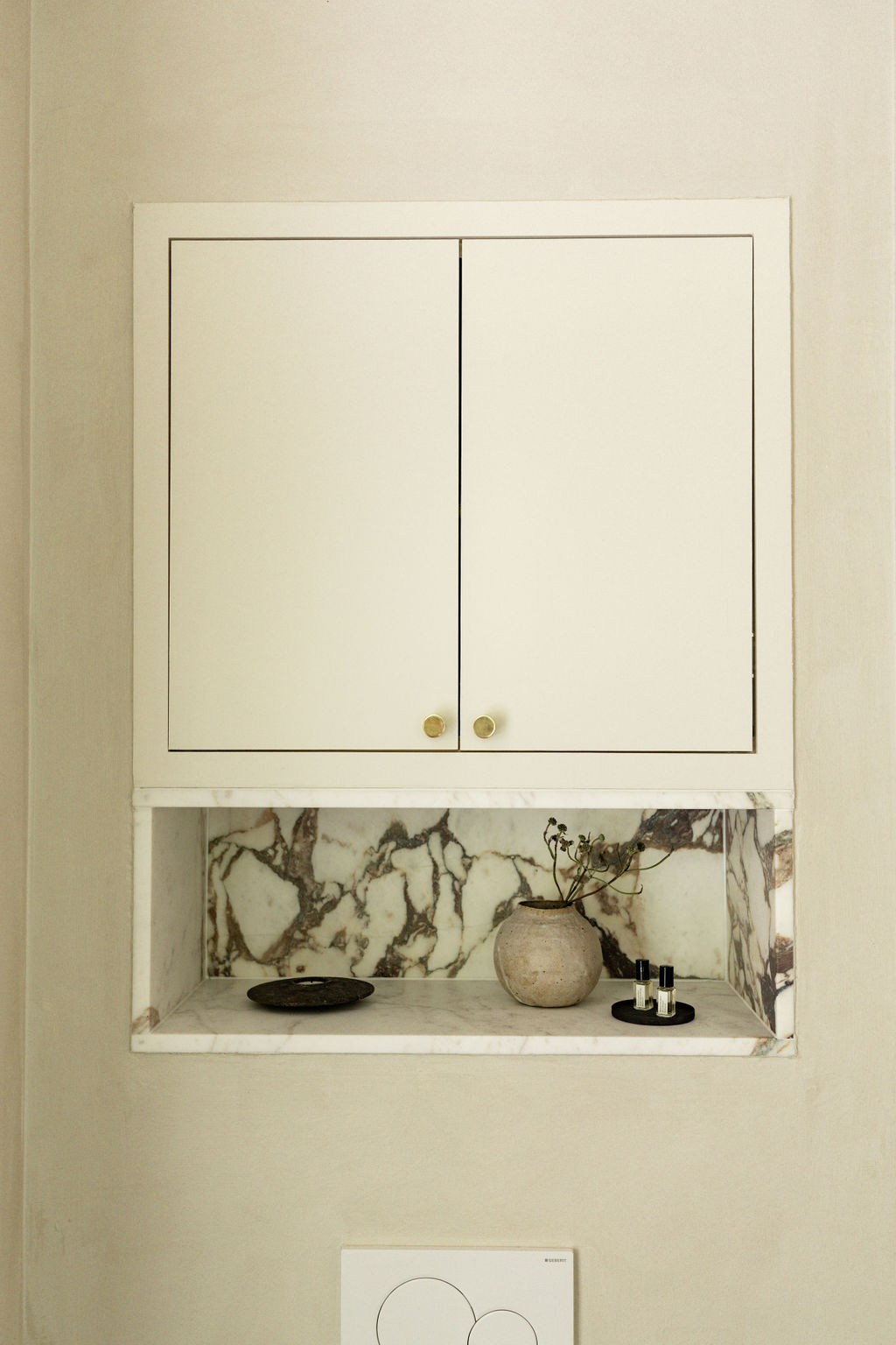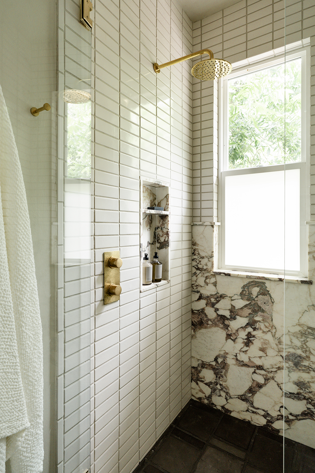 The catch was, they only had the budget for one slab of the statement stone. “Naturally, we wanted to place it strategically,” the designer continues. Brown thoughtfully used all of it by peppering it in every corner: the shower wall under the window, the vanity counter and backsplash, the shampoo shelf, the sill next to the tub, and the cabinet niche over the toilet.