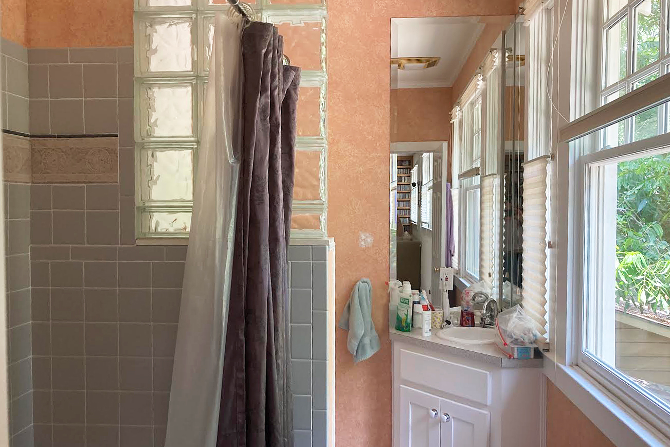 For starters, when they entered the 50-square-foot space, they were greeted by an alcove tub and, to the left, a glass block-wall partition. Directly behind the divider was a minuscule, not-up-to-code toilet and corner sink. Brown worked with female-owned firm Skelly Build to bump out the exterior wall of the second-story area by 3 feet and 8 inches, almost doubling the room’s size to 86 square feet. What she was left with was the opportunity for a separate tub and shower and a double vanity with loads of storage for hair gel, nail polish, razor blades—you name it.