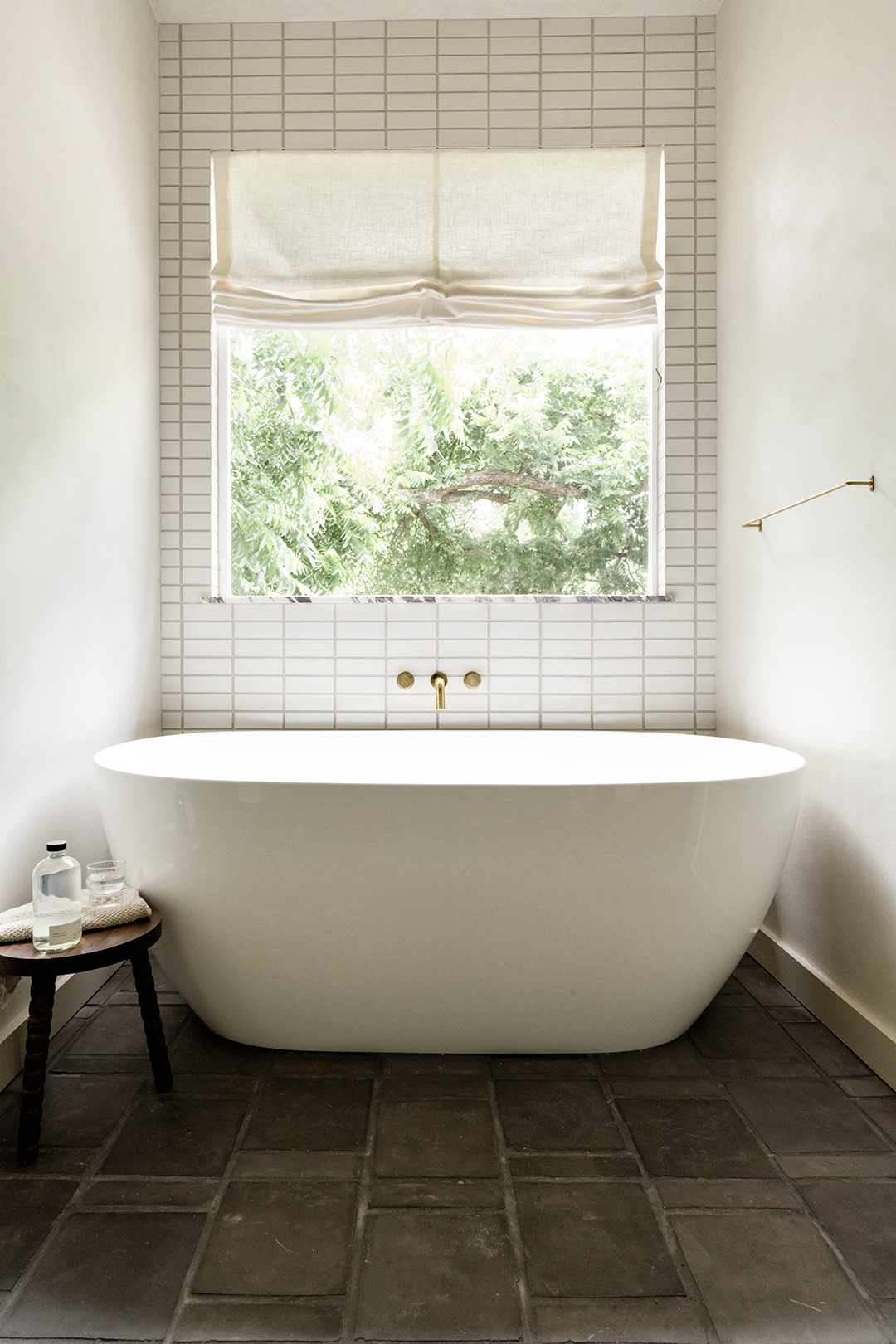 The limewash-painted walls were an affordable alternative to covering them in tadelakt, a trendy, costly, and waterproof treatment. The only caveat was that they couldn’t use Portola Paints’s product near the shower and had to seal it everywhere else so it can hold up in the humidity. Brown kept the unexpected textures going with unlacquered brass faucets that will patina with use and Belgian terracotta floor tiles from Clé Tile. “This client wasn’t afraid to do something different than her neighbors,” says Brown. That is our kind of show-and-tell.