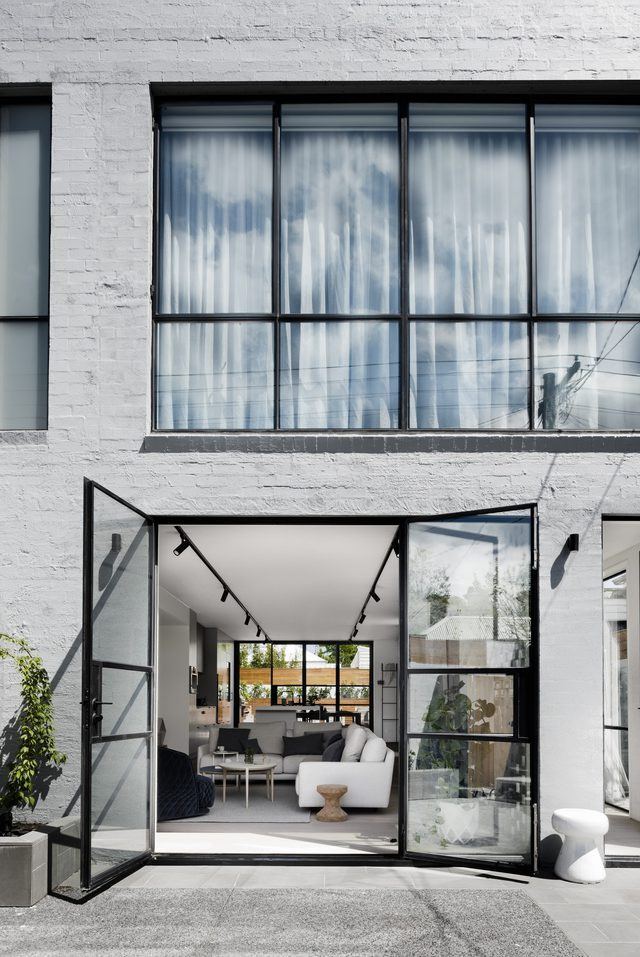 To further emphasize the illusion of space without losing the garage’s charm, Flanigan provided her builder with buckets of paint rather than instructions to remove the millwork, which originally came from the University of Texas’s School of Law. Covering up the warm-toned stain in Benjamin Moore’s creamy white Sheep’s Wool and extending the color to the ceiling immediately made the guest suite feel bright and airy (though Flanigan did save some of the wall for the bathroom door), while simultaneously hiding cracks and other imperfections.