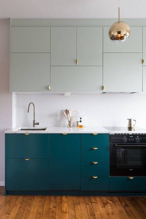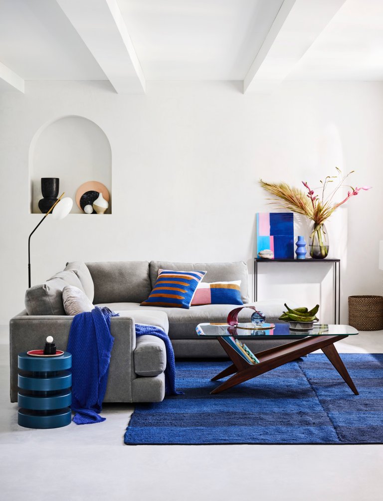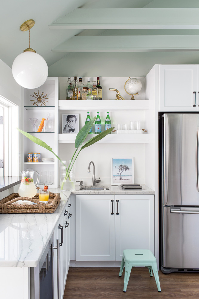 Without a lot of walls dividing up the space, Flanigan had to create zones in other ways. The laundry nook, for instance, is concealed by floor-length cabinet doors that look as if they could lead to a pantry. On the right side of the sink, everything from dry goods to glassware (even a mini Smeg refrigerator) is tucked into matching cupboards. “By not creating a whole room, you save so much space and keep it clean and beautiful,” Flanigan points out.