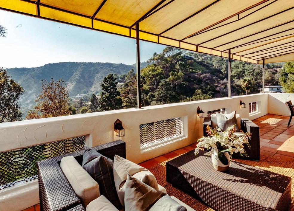 Situated in the luxury Outpost Estates neighborhood—an exclusive area overlooking Runyon Canyon—the four-bedroom, four-bathroom home sits cozily against the grassy hillside. Multiple balconies adorn the back exterior of the 1930s-era home, offering scenic views of the lush 8,228-square-foot lot.
