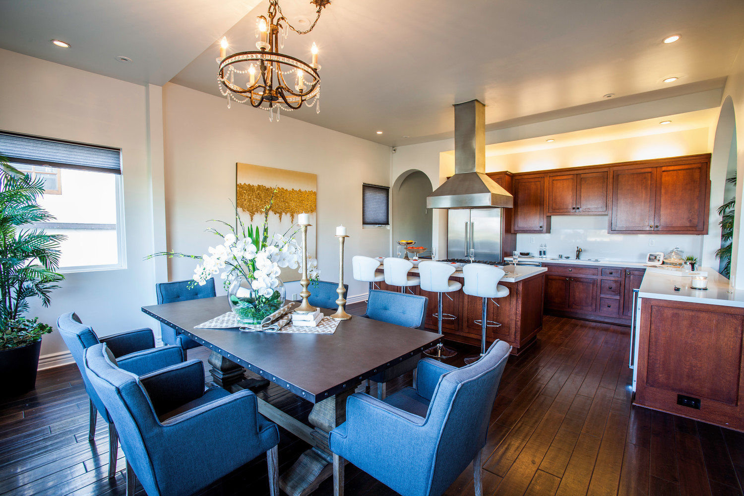The swanky chef’s kitchen includes a huge center island and opens up to a