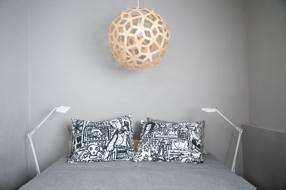 A cutout wooden pendant lamp and a graphic pillow print add geometric elements to a toned-down kid’s room.