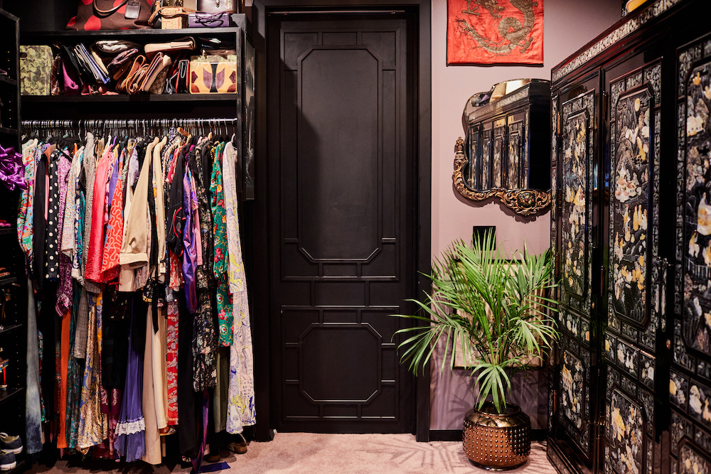 But that space just holds her hero wardrobe items. Elsewhere, off the living room, she built a 22-foot-long closet that houses additional accessories and fabrics, plus a small desk and a washer and dryer. On the walls in here? New Hat that’s called Crappy Magic—it features images of things found in thrift shop bins, like plastic Barbie doll arms and rubber snakes.
