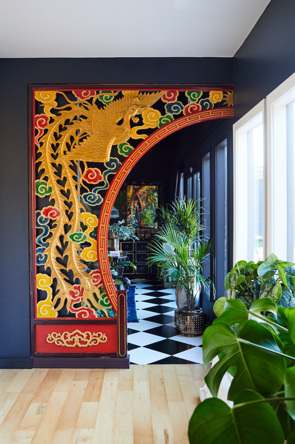 As the daughter of an antiques dealer, Callaway grew up appreciating old things and shopping secondhand whenever possible (around 80 percent of her furniture is vintage). Her Facebook Marketplace settings are a testament to her love of thrifting. Chinoiserie, Regency, wicker, and lacquer are just a few of the search terms she’s saved, so that when any items relating to these words are listed within a 100-mile radius, she gets notified. That’s how she uncovered a giant $700 arch that was once a part of a Chinese restaurant. “I asked the guy I had a crush on to go with me to rural Alabama with a truck and pick it up. I told him we were moving something, but I didn’t tell him what it was. We didn’t date—I don’t know if this contributed,” she says, laughing. Callaway immediately knew she wanted to turn it into a threshold to her bedroom.