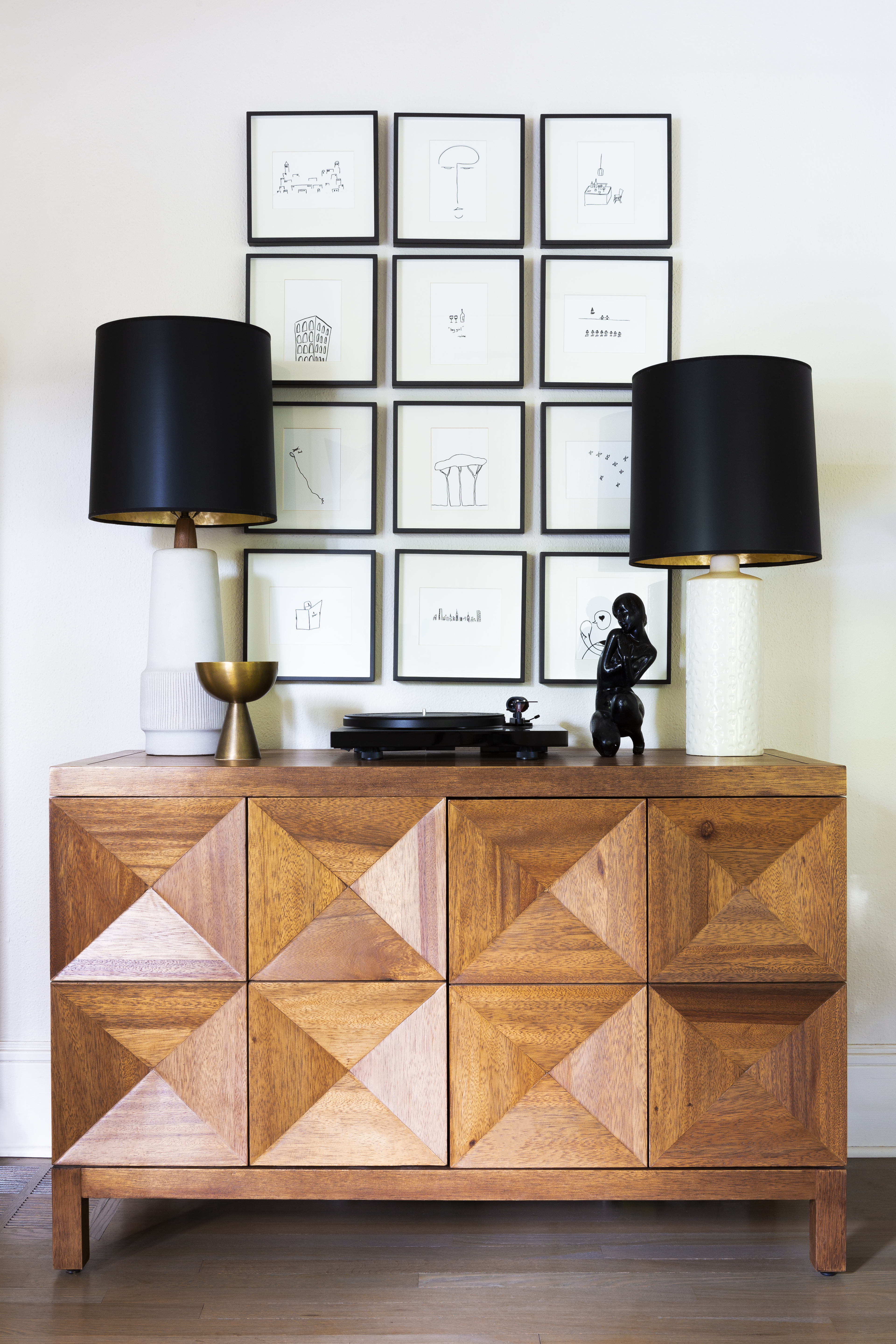 Sentimentality is yet another major component of Vaughan’s approach to interior design. Above the credenza in the living room, a curated gridded gallery wall boasts sketches by Vaughan’s husband, depicting their travels throughout the years. The mirror decking the fireplace mantel was the first thing she and her husband bought together while at the Rose Bowl in California.