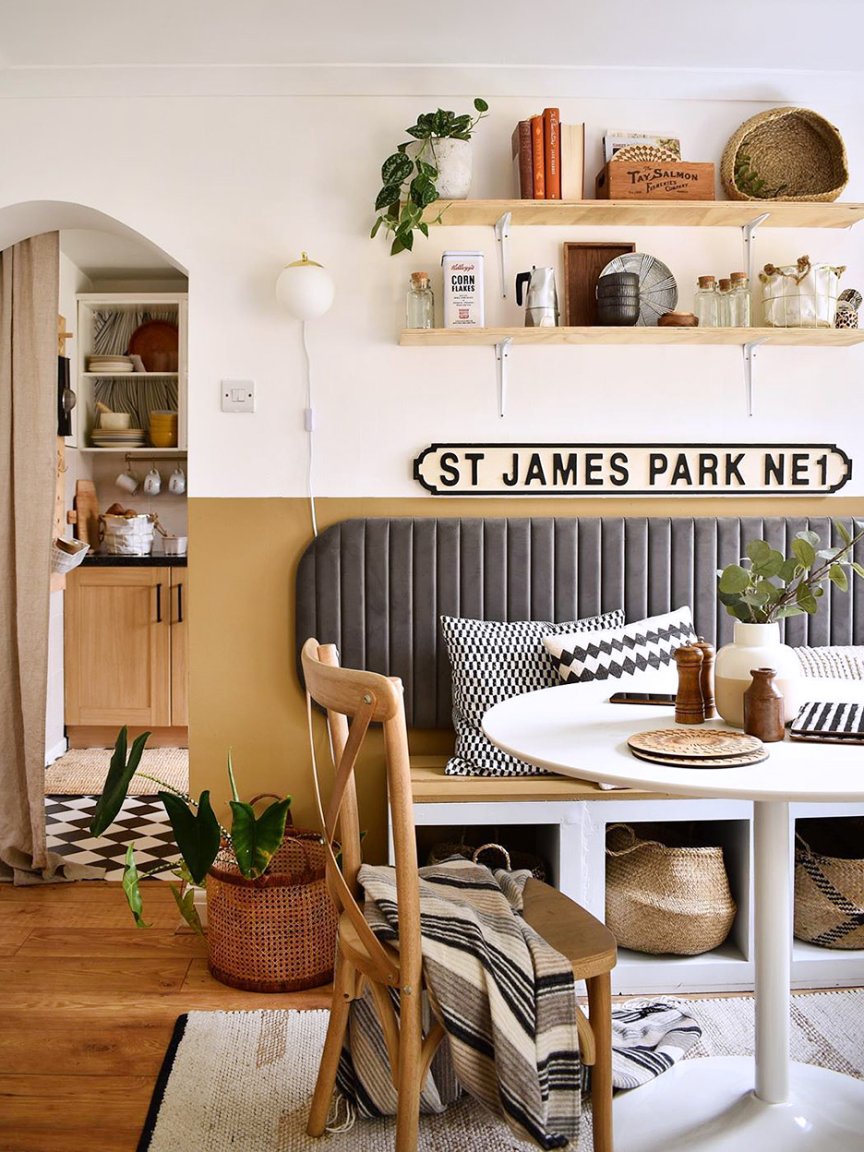 In quarantine, she decided to make the change, and so she used plenty of materials she already had in her garage. She painted the walls half white and half warm, golden taupe; created a new bench using a few IKEA Kallax shelves she had on hand; and swapped in a smaller table and wood chairs. A simple gray headboard she was gifted from British design store Next gave off that café look she was craving. Since it came without bottom pegs already attached, all she had to do was affix it to the wall with the help of a few sawtooth picture hangers (making sure to screw them into the wood frame of the headboard, not the plush part, to ensure it stayed stable).
