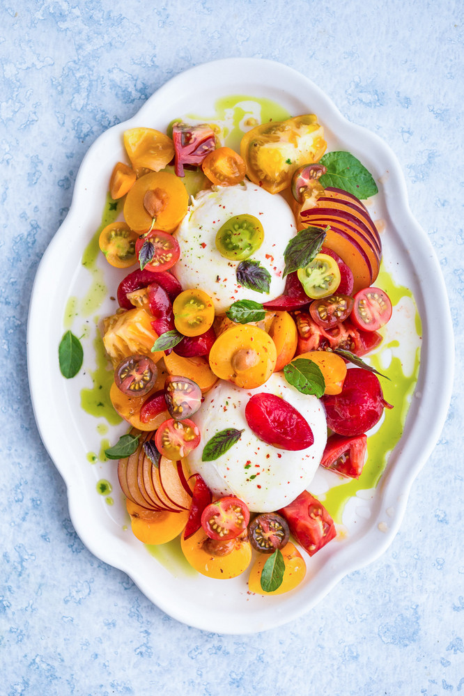 We can’t imagine an Italian meal sans at least one course that features fresh mozzarella or burrata. Simply pair it with heirloom tomatoes, fresh basil, and a drizzle of olive oil and you’re set. Take things to the next level by adding in stone fruit for a sweet note, just like this mint-basil vinaigrette-dressed dish from Vegetarian Ventures.