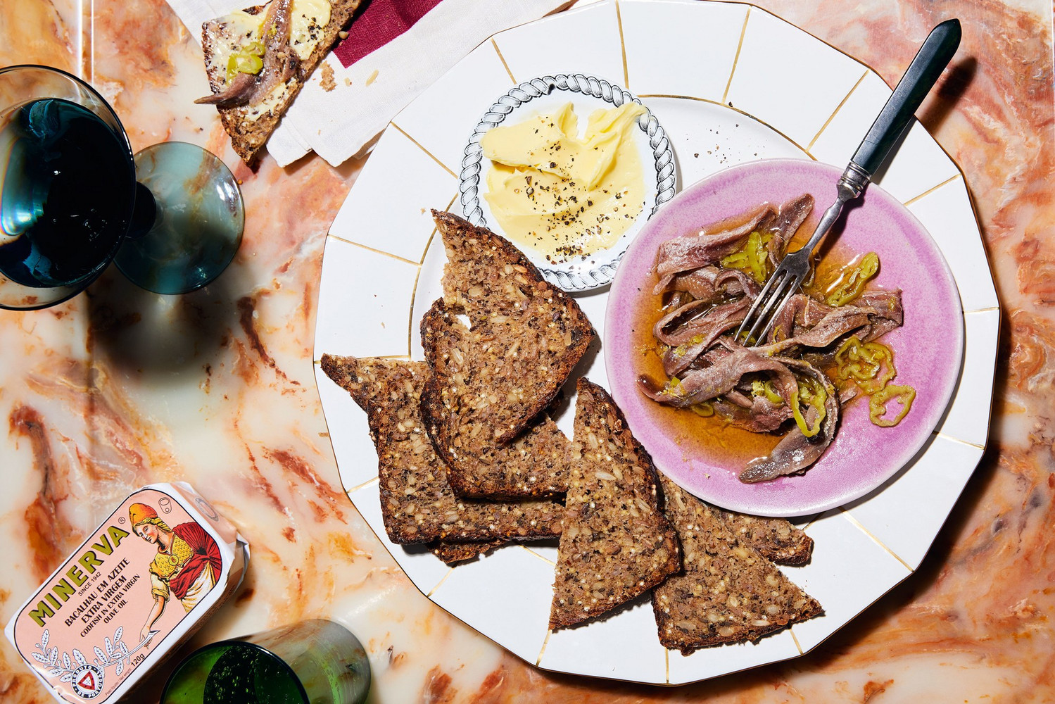 A far and distance cousin of the sardine, anchovies typically get a bad rep as a result of their often salty taste. But buy them fresh and marinade it yourself and you’ll end up with a deliciously refreshing ingredient that can be paired with a wide variety of dishes. We’re loving this rendition from Bon Appetit, featuring oil-packed anchovies and a white vinegar marinade with a lemon-peperoncini garnish.