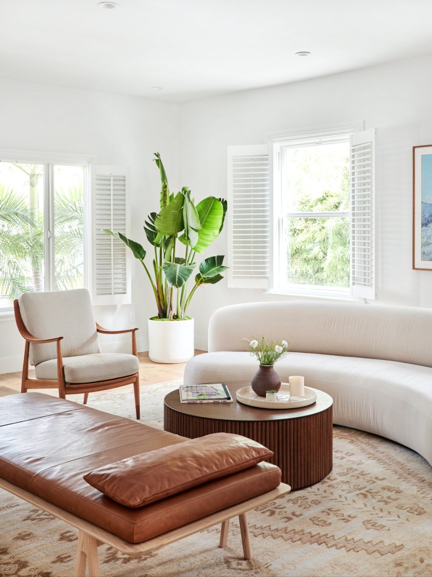 Instead, Burstin focused on the furniture, splurging on attention-grabbing pieces like a Pierre Augustin Rose sofa and MSDS Studio’s leather-and–white oak daybed—things that made you want to sit and stay awhile. “We didn’t want it to be a room you weren’t allowed to go in or a space you just walked through,” says the designer.