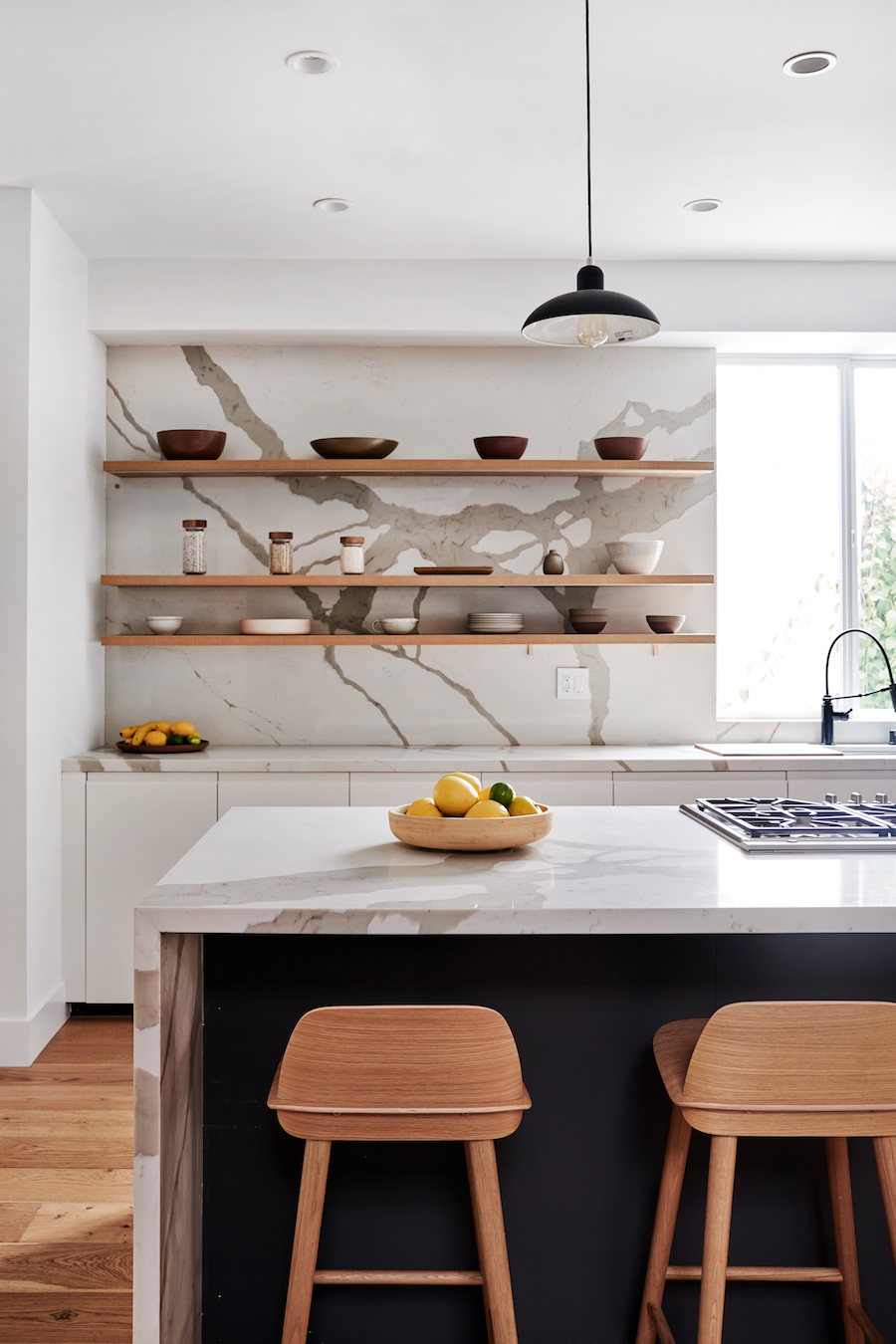 When Burstin walked through the home for the first time, it was clear the renovators had splurged on statement lighting. The problem was the fixtures weren’t consistent with the modern vibe of the rest of the home. The pendants over the kitchen island, especially, skewed harsh and industrial for the warm, sandy-colored marble countertops. They were also way too big. Burstin replaced the fixtures with slim, mid-century ones from Design Within Reach.