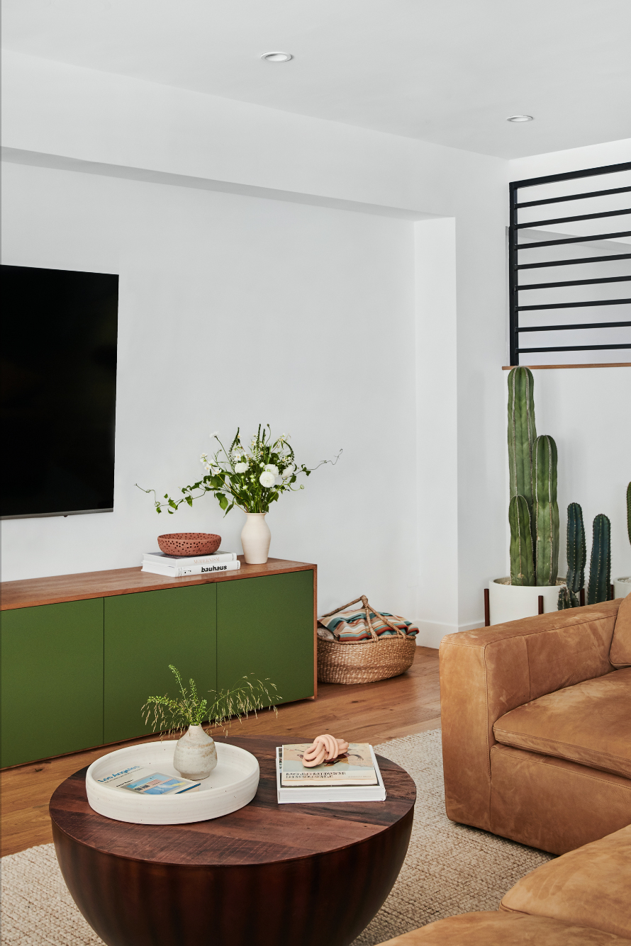 Bespoke pieces, like a lacquered green media cabinet in the living room that stretches 11 feet, instantly added character to the house. But when Burstin brought Croft House’s platform Hudson bed into the master bedroom, she realized she would have to relocate all the electrical outlets—the piece didn’t fit into the predetermined layout. The extra step was worth it. “Most people get a flipped house because they don’t want to do the work, but if there’s something you want to change, do it,” she shares.