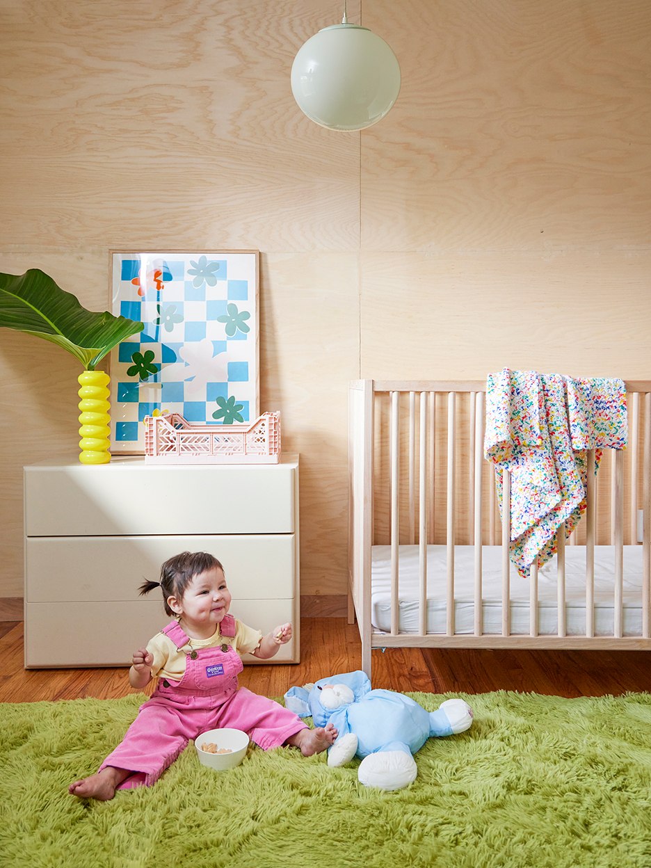Brill’s father-in-law lent a hand in Margot’s nursery by covering the dated textured wall with four sheets of birch plywood. It also solved another problem: bringing warmth into the room without relying just on paint. “That’s my aesthetic—playful, minimal, and a touch vintage,” she says. She also has a soft spot for laminate storage cabinets from the ’80s. Bonus: They wipe down clean. “We’ve been hunting them down all over Portland,” she notes.