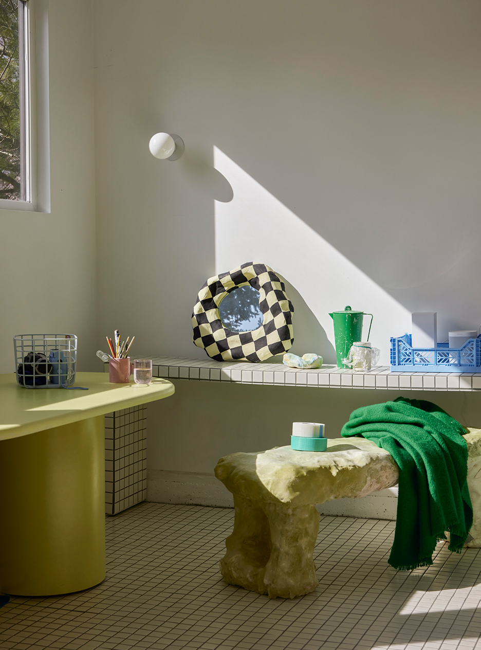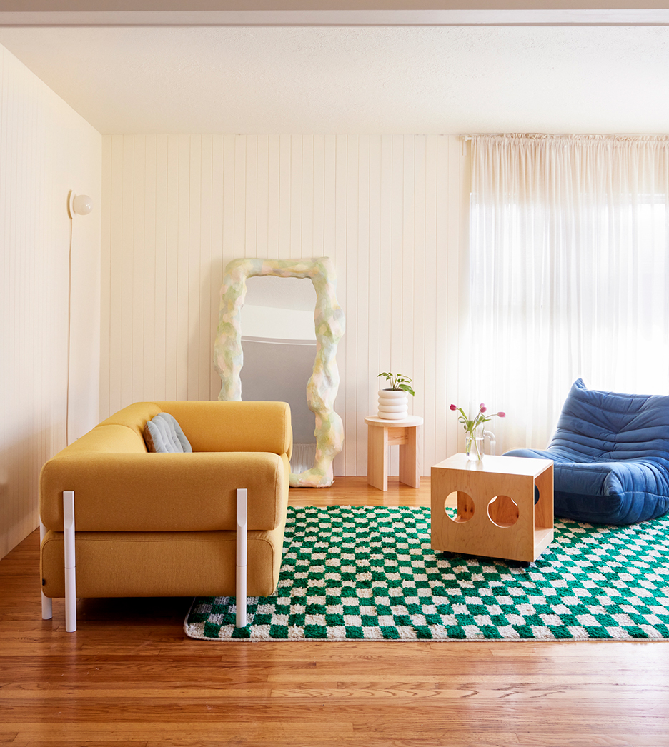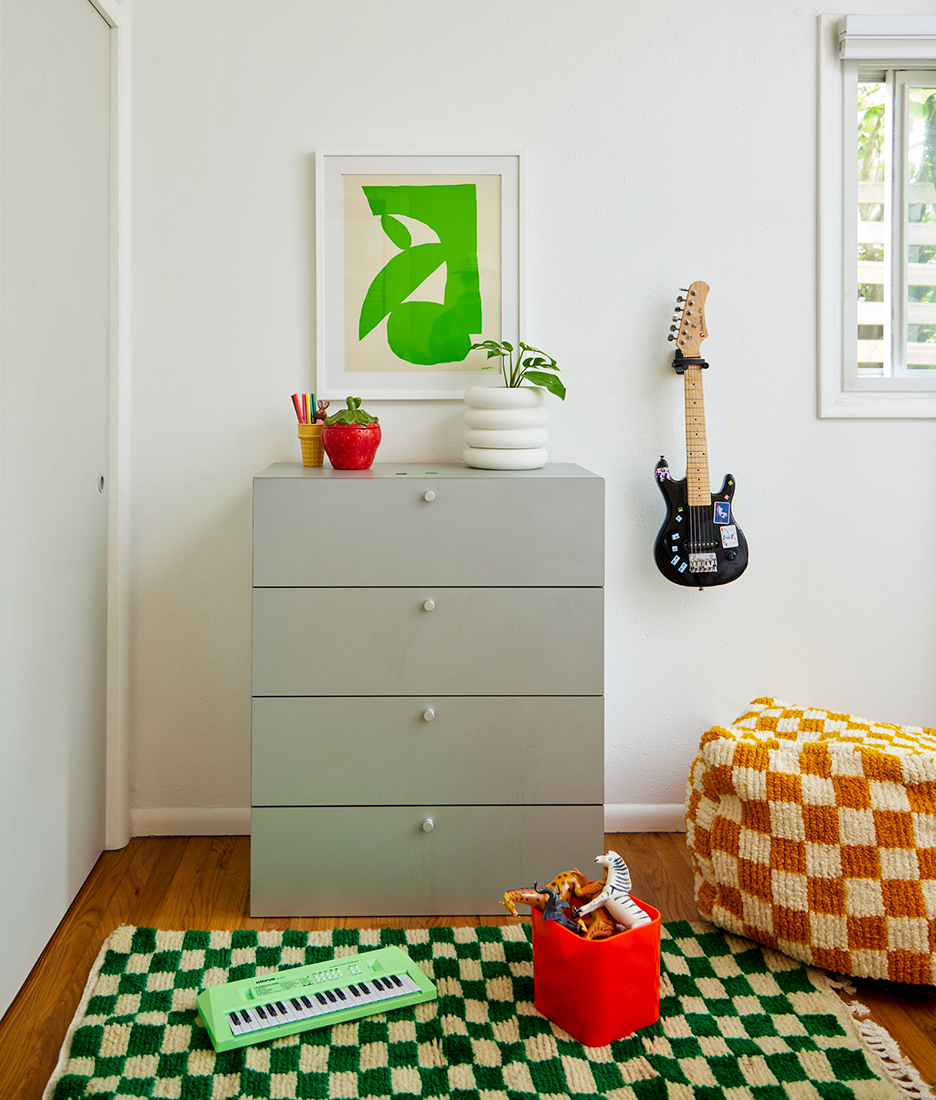 Soft and creamy colors Brill best describes as chalky informed her newfound palette. “I was raised in the ’90s, so it’s nostalgic for me,” she says. Checkered patterns also have special meaning for the artist: They remind her of the notepads her engineer dad always had lying around the house. “They add order to all the other things that are curvy and fluid,” she says, like the abstract botanical shapes she painted on the wall in Zara’s bedroom (the pastel silhouettes were inspired by a design at a local ice cream shop). “If you can’t afford all the cool furniture you want, doing something like that can really make a space feel customized and special,” she explains.