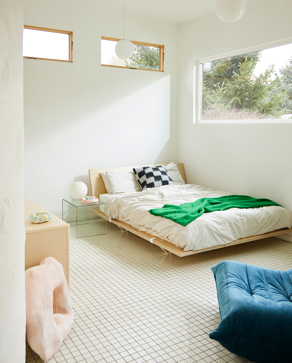 Brill had always planned on converting the attached garage into a livable addition (they never park their car in there anyway), though originally she was picturing a sunken living room. Then the pandemic hit and the pair realized the extra 400 square feet would be better served as their main bedroom-slash-studio, allowing them to free up a bedroom for Margot and hide breakable objects, including George’s film gear. The couple added six windows to the room, including two 8-foot-long ones positioned high up on the walls, so whether they’re soaking in the tub or laying in bed, they see only blue sky and pine trees.