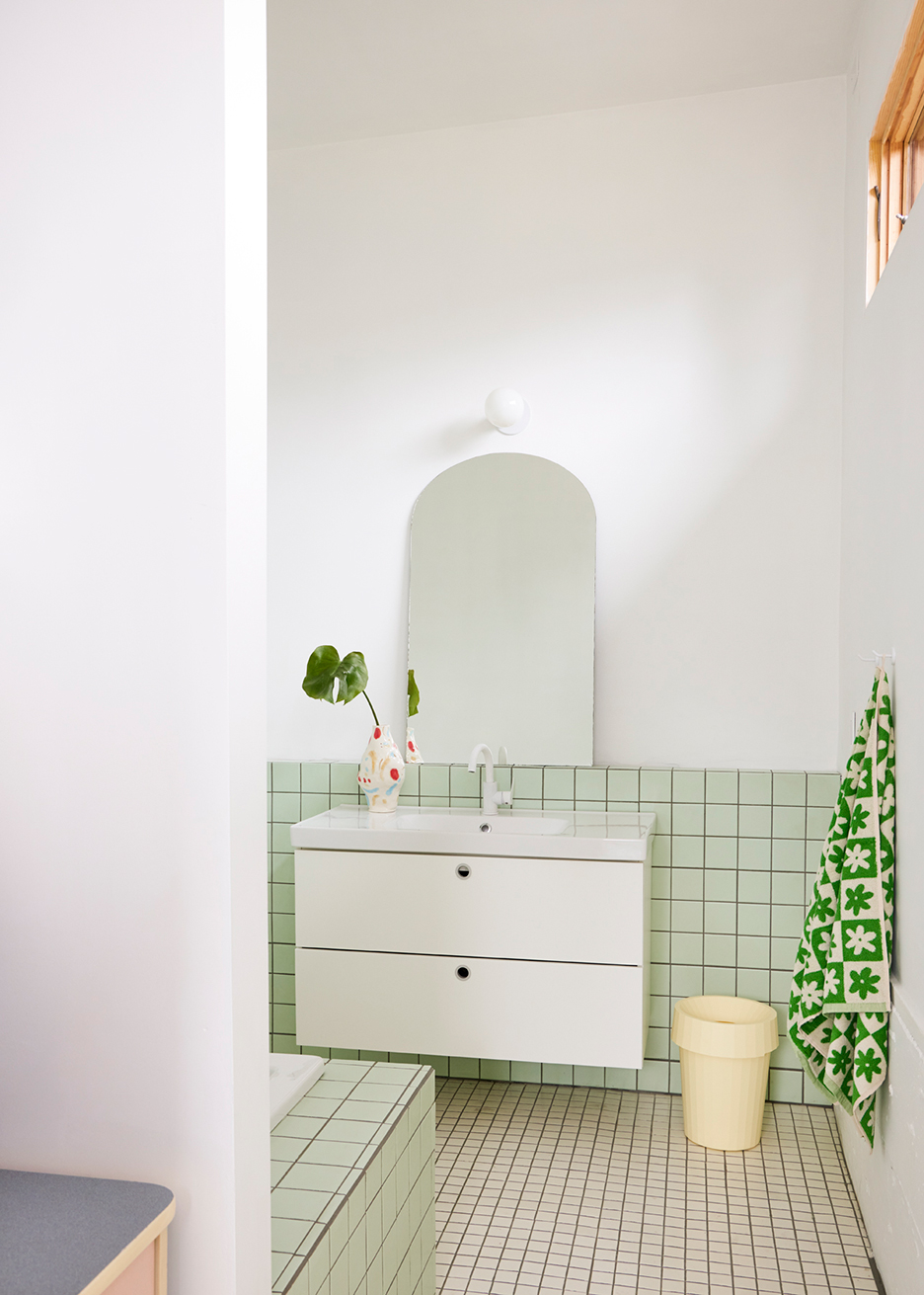 This go-round Brill got the genius idea to extend the lower cupboards (and the countertop), allowing them to get rid of the uppers without losing any storage. While she was at it, she decided to rip out the too-busy black and white backsplash and replace it with zen green squares. “We gained more courage as we went along DIYing things,” she says. “That opened up a whole other door for us.”