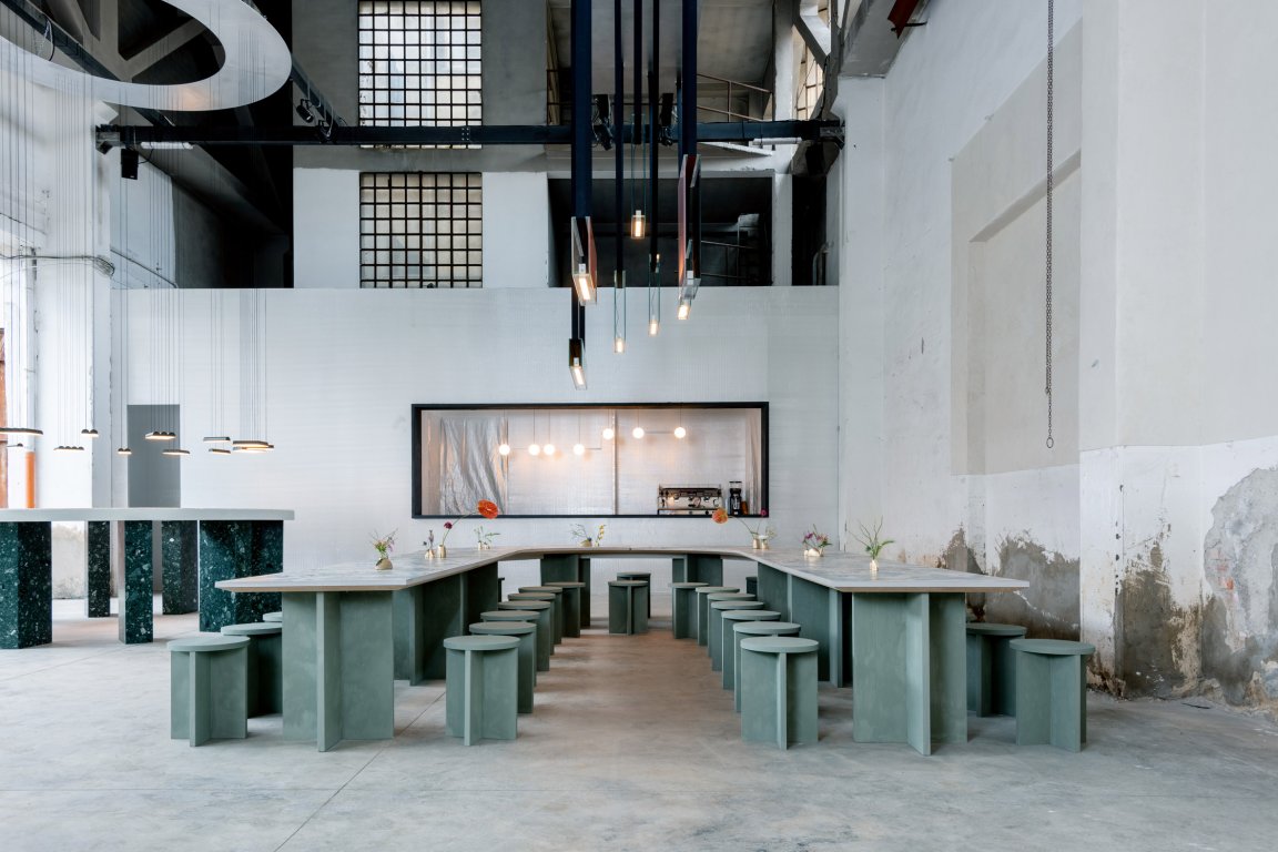 Set in a former panettone factory, the space is designed with a mix of ancient and modern elements. Think: lush white marble meets dark green terrazzo. Two table structures—one round and one U-shaped—are designed to make the eating and drinking experience a social one. Here, guests are encouraged to converse as they enjoy their dinner.
