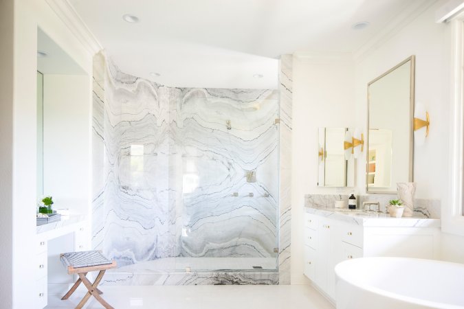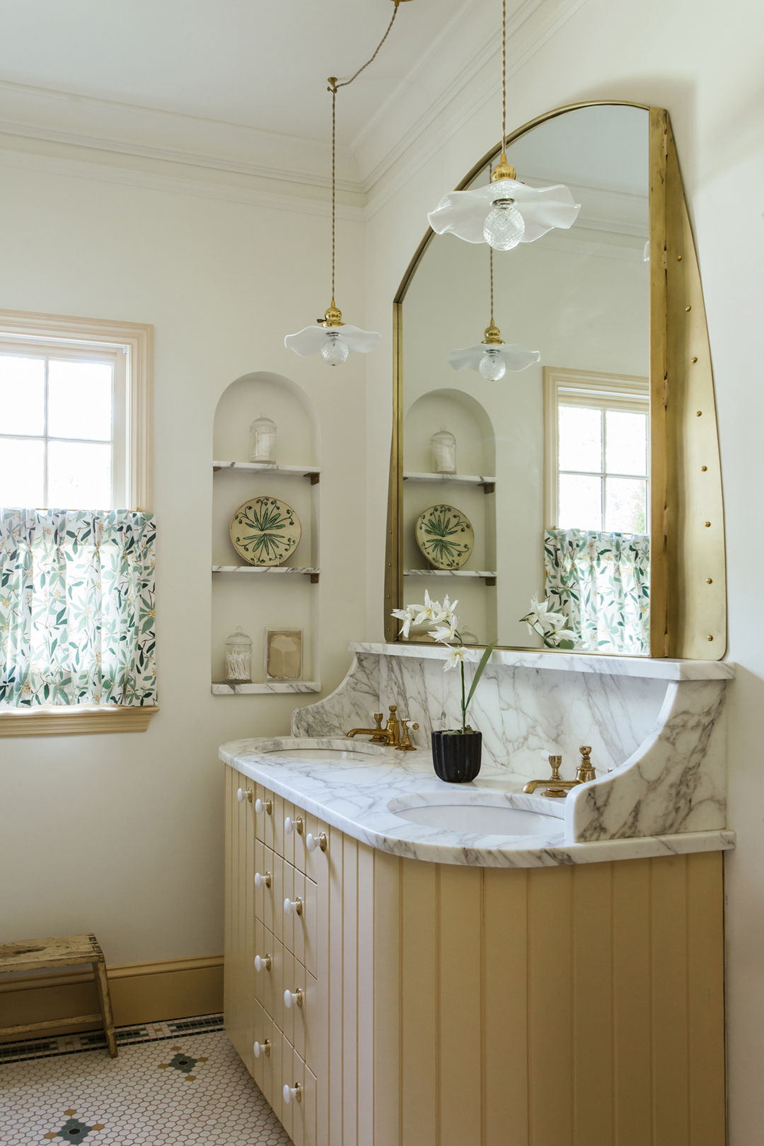 The project was not without its external conflicts either. Stewart struggled to convince the contractor to redo the powder room’s layout after the drywall had been installed. “The way the sink was positioned, there wasn’t enough room to bend down to get to the vanity cabinets,” she explains. “It was a nightmare.” By straightening out the previously sloped ceiling, the storage could finally function as intended.