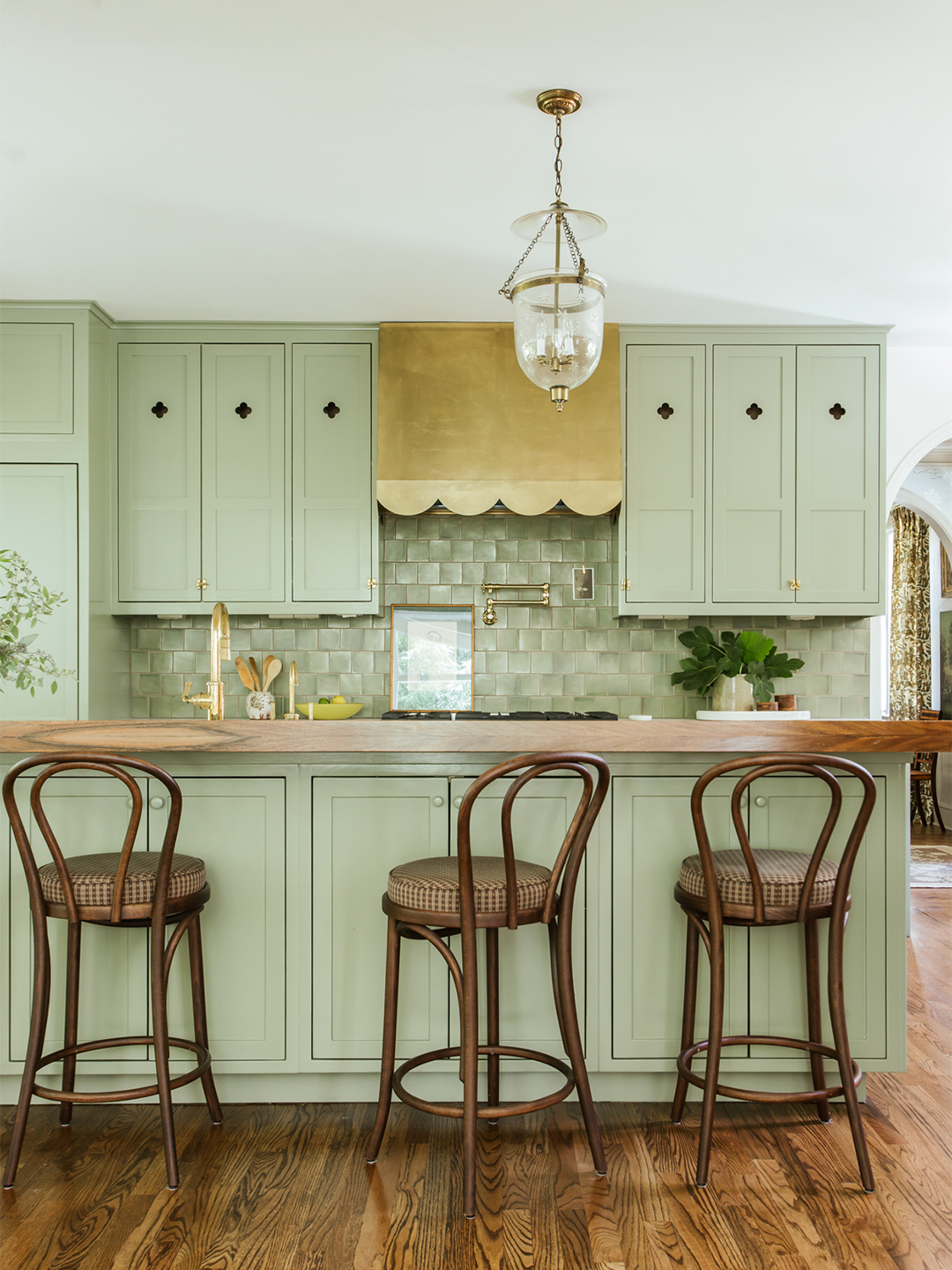 Fontaine granted Stewart full creative control in some spaces, going against her typically type A personality (that’s the power of friendship). The kitchen was one such room. Lucky for all parties involved, it had been fully gutted about five years prior; the layout was perfectly functional. Charm, however, was nowhere to be found. Reimagining the preexisting cabinets and island with custom door fronts and a lick of green paint, Stewart transformed the space. A brass hood, Fontaine’s favorite addition, is a style compromise in action: The scalloped edges match her classic sensibilities, while Stewart pushed for the bolder, shiny finish.