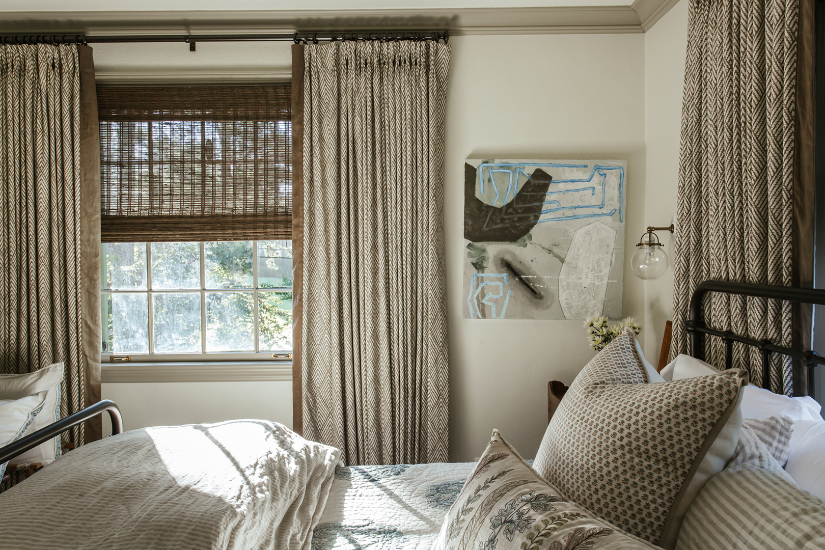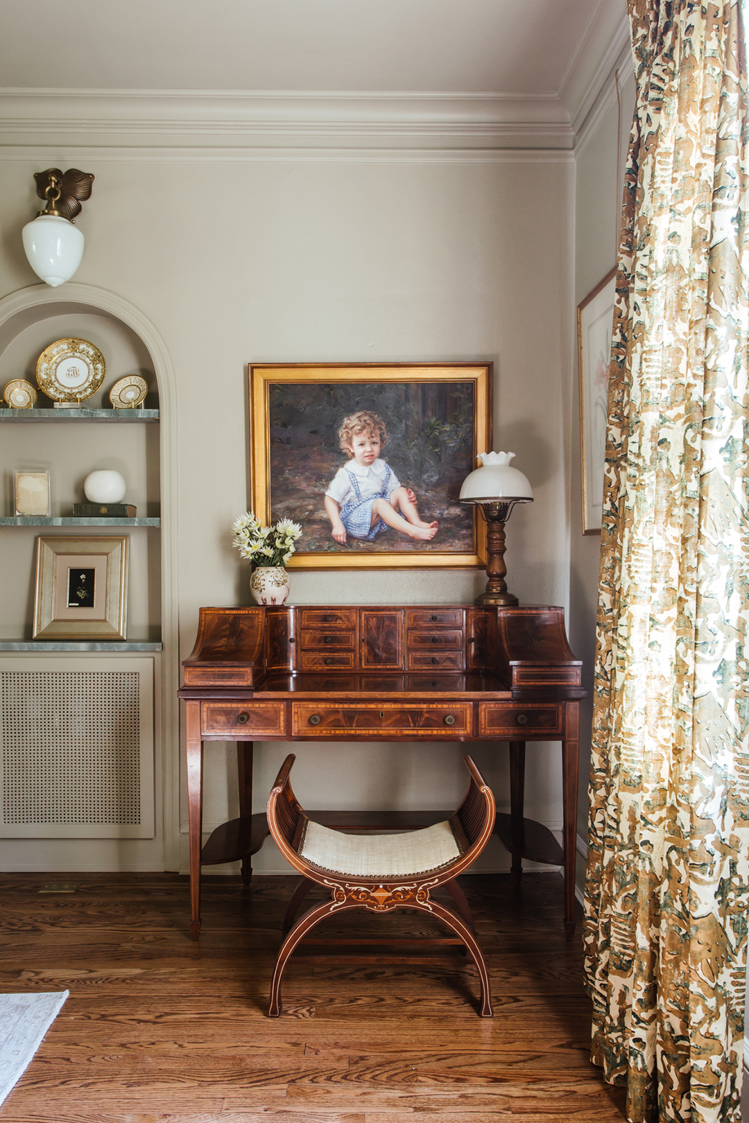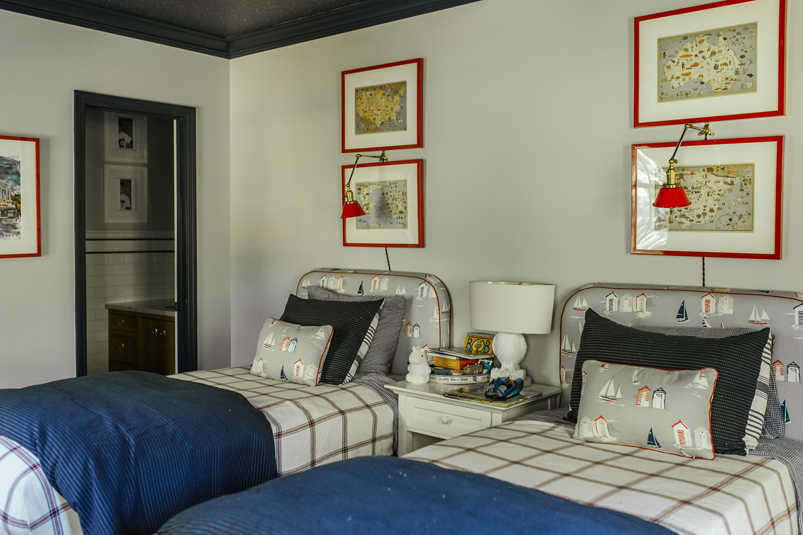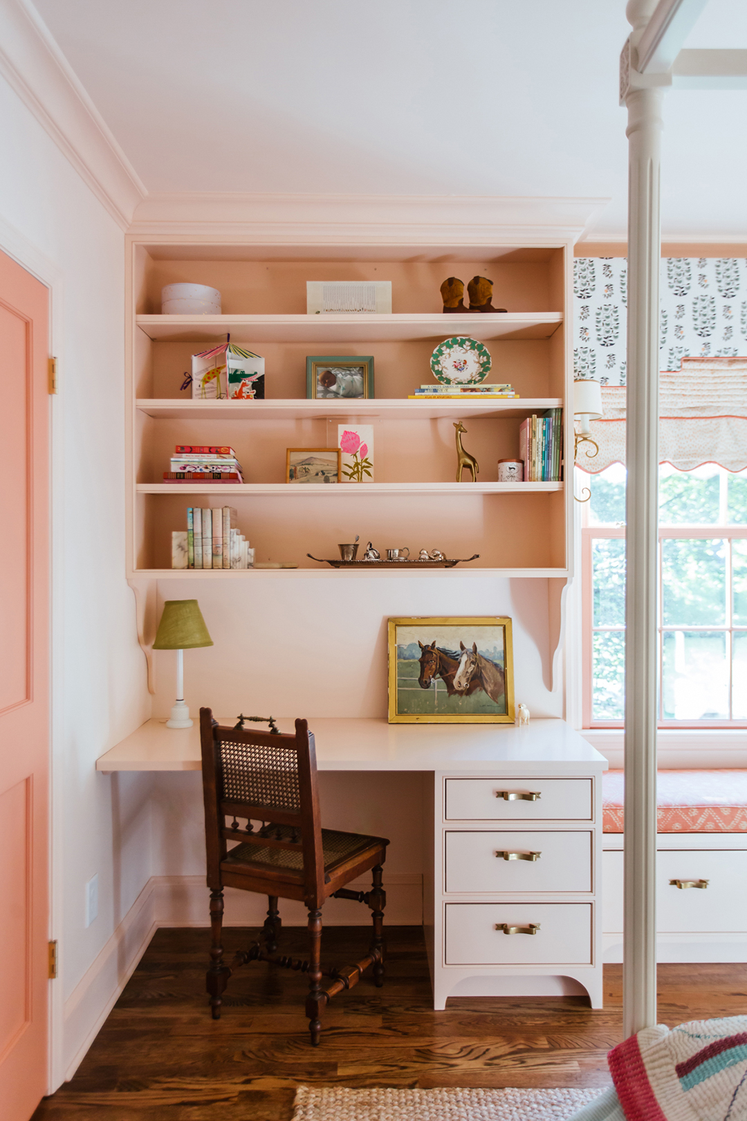 Upstairs, the kids’ rooms were total teamwork. Fontaine selected cheerful pastel pink walls for her 5-year-old daughter’s bedroom, which features a cushy window seat (Stewart’s contribution) and built-in desk for drawing—the space needs to age with her. In her 4-year-old son’s bedroom, the nightstand between the twin beds was chosen specifically for its ability to hold all his favorite bedtime stories within arm’s reach.