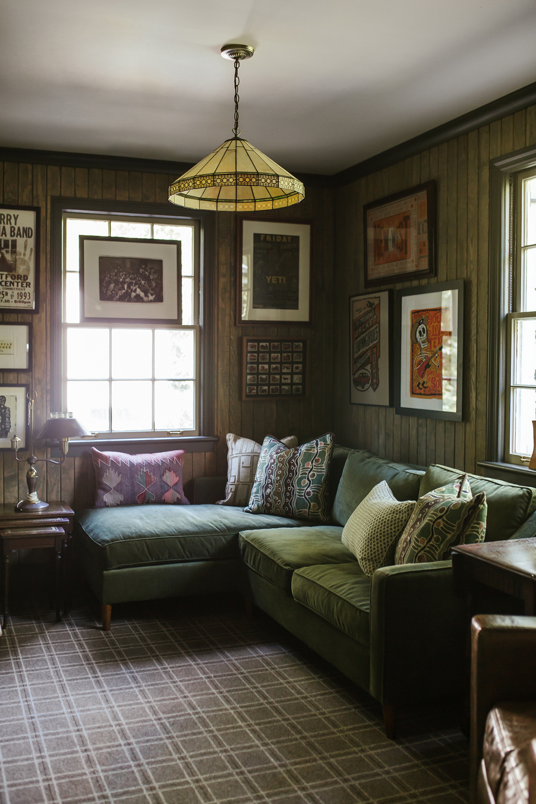 The one thing Fontaine’s husband had strong opinions about was the lounge–slash–record storage spot, once a spare room. Complete with olive green–stained wood paneling and a matching velvet sectional, the tiny (but cozy) space quickly became a WFH sanctuary when the pandemic hit. “It was just supposed to be this lounge for him, but he spent all day, every day in there,” says Fontaine.