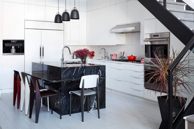 The couple opened up the rear wall to provide a distinct line of vision to the deck and courtyard, allowing a flood of light to feed into the kitchen. Another change came by way of creating an open-plan space. “We enlarged the openings on the floor allowing the living room to flow through to the dining area and kitchen,” she notes. “The kids can be playing in the living room or on the deck while we’re cooking in the kitchen.”