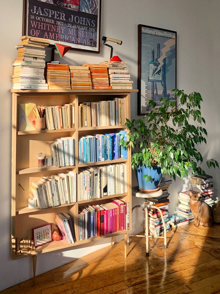 My husband had a friend of his make the three-legged bookshelf. We live in this weird loft—one of those rare rent-controlled, definitely under-code, definitely flammable Brooklyn buildings that you hear about but don’t see very much anymore, and my husband has been here for more than 10 years, so I got grandfathered in with him. Because of the way the building is carved up into these units, there are a lot of irregularities, and one of them is that the wall is extremely slanted. It doesn’t hit the other wall at a 90-degree angle. Teddy had the idea to have his friend who’s a furniture-maker create this three-legged bookshelf that would make it appear as though the wall was straight even though it’s not. It’s not a staple piece of furniture, because it has to be bolted to the wall—it’s the ultimate site-specific bookcase.